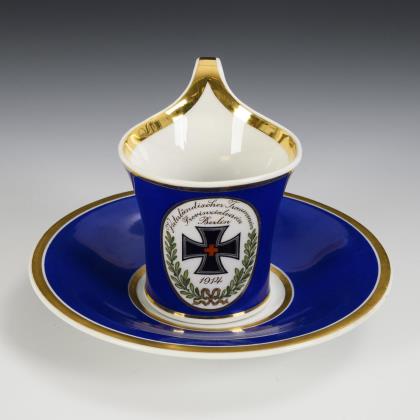 Gefußte Glockentasse mit Perlbandhenkel. Blauer Fond, schauseitig ein palmwedelgerahmtes Medaillon mit dem Eisernen Kreuz 1914