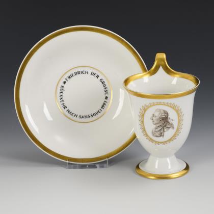 Gefußte Glockentasse mit Campanerhenkel. Schauseitig ein Medaillon mit dem grisaillegemalten Bildnis Friedrichs des Großen, im Spiegel der Untertasse die Aufschrift "Friedrich der Große / Rückkehr nach Sanssouci 1991"