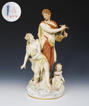 Orpheus, ein begnadeter Sänger und Musiker und die Nymphe Eurydike, ein Liebespaar der griechischen Mythologie. Farbig bemalt, gold staffiert, rückseitig am Sockel reliefierter Titel. Ritzmarke, blaue Zeptermarke, rote Reichsapfelmarke, Malermarke von Pfeifer