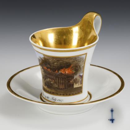 Modell "Konisch" mit Campanerhenkel. Schauseitig eine goldgerahmte Rechteckkartusche mit der datierten Darstellung des Schauspielhauses in Berlin, das am 29. Juli 1817 durch einen Brand zerstört wurde, innen vergoldet