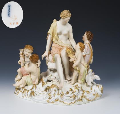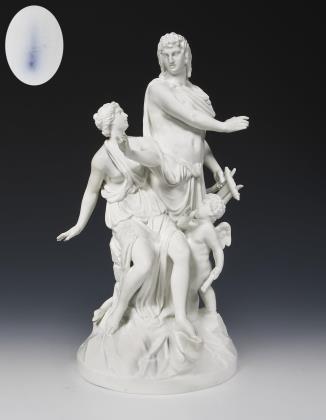 Venus, die Göttin der Liebe und der Schönheit und der schöne Jüngling Adonis, ein berühmtes Liebespaar der römischen Mythologie, die Erzählung endet tragisch, als Adonis während der Jagd von einem Eber getötet wird. Farbig bemalt, gold staffiert. Pressmarke, blaue Zeptermarke, rote Reichsapfelmarke, Malermarke
