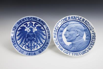 1x Teller zum 25jährigen Thronjubiläum Kaiser Wilhelms II., 1913, bezeichnet "S. Wernekinck": im Spiegel das Reliefporträt des Kaisers mit der Umschrift "Wilhelm II Deutscher Kaiser König v. Preussen / Gott mit uns". / 1x Teller mit der Darstellung des Reichsadlers mit der Umschrift "Deutschland Deutschland über alles 1914"