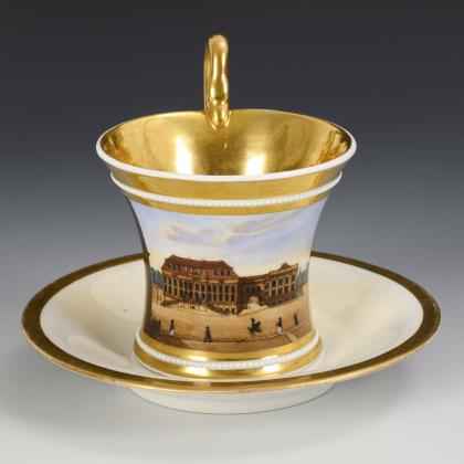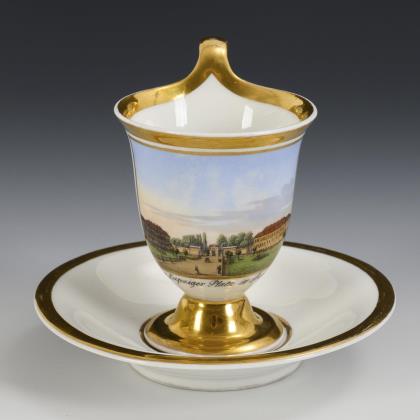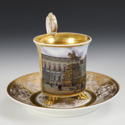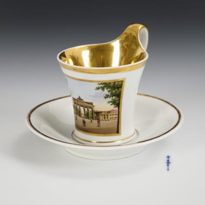 Zylindertasse mit Kraterrand, Rosettenhenkel und drei Tatzenfüßen. In einer goldgerahmten Rechteckkartusche die bezeichnete Darstellung des Denkmales Friedrich II. Unter den Linden in Berlin, verso reiche vegetabile Goldmalerei, innen vergoldet