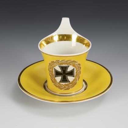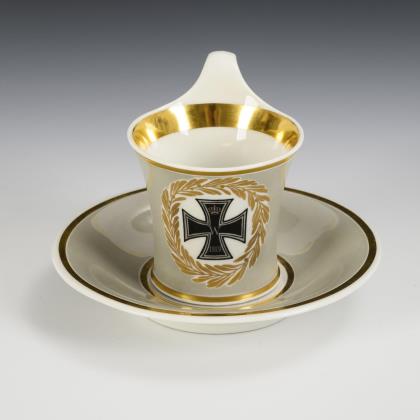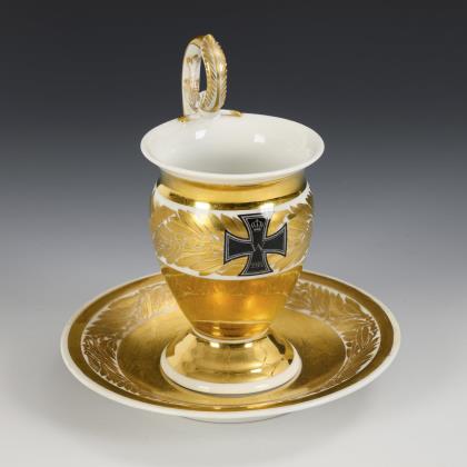 Gefußte Glockentasse mit Delfinhenkel. Goldener Teilfond sowie schauseitig das Eiserne Kreuz vor einem goldenen Lorbeerband