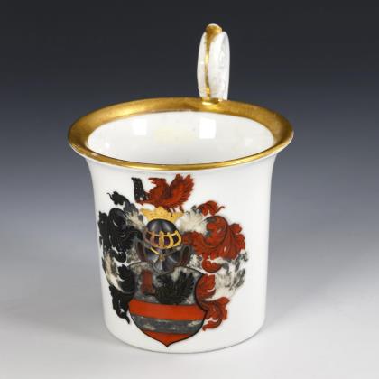 Zylindertasse mit Kraterrand und Rosettenhenkel. Schauseitig ein Wappen mit Adler und Turm. Ohne Untertasse