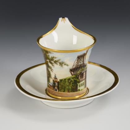 Gefußte Glockentasse mit Campanerhenkel. In einer goldgerahmten Kartusche die bezeichnete Darstellung des Sommerschlosses Friedrich II. mit dahinter sichtbarer Mühle, innen vergoldet