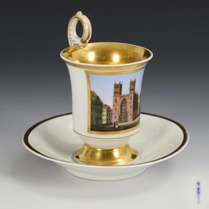 Gefußte Glockentasse mit Palmettenhenkel. In einer goldgerahmten Rechteckkartusche die bezeichnete Darstellung der Werderschen Kirche (Friedrichswerderschen Kirche) in Berlin, innen vergoldet