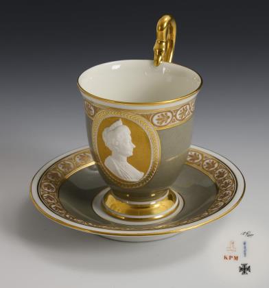 Anlässlich des 100. Geburtstages der Königin Luise. Gefußte Glockentasse mit Schwanenhenkel. Hellgrauer Fond unter polychromer Kleeblattbordüre, schauseitig ein würmelbandgraviertes Goldfondmedaillon mit dem Biskuitporträt der Königin Luise von Preußen (1776-1810), innen vergoldet. Im Spiegel der Untertasse die biografischen Daten "Den 10. März 1776=1876