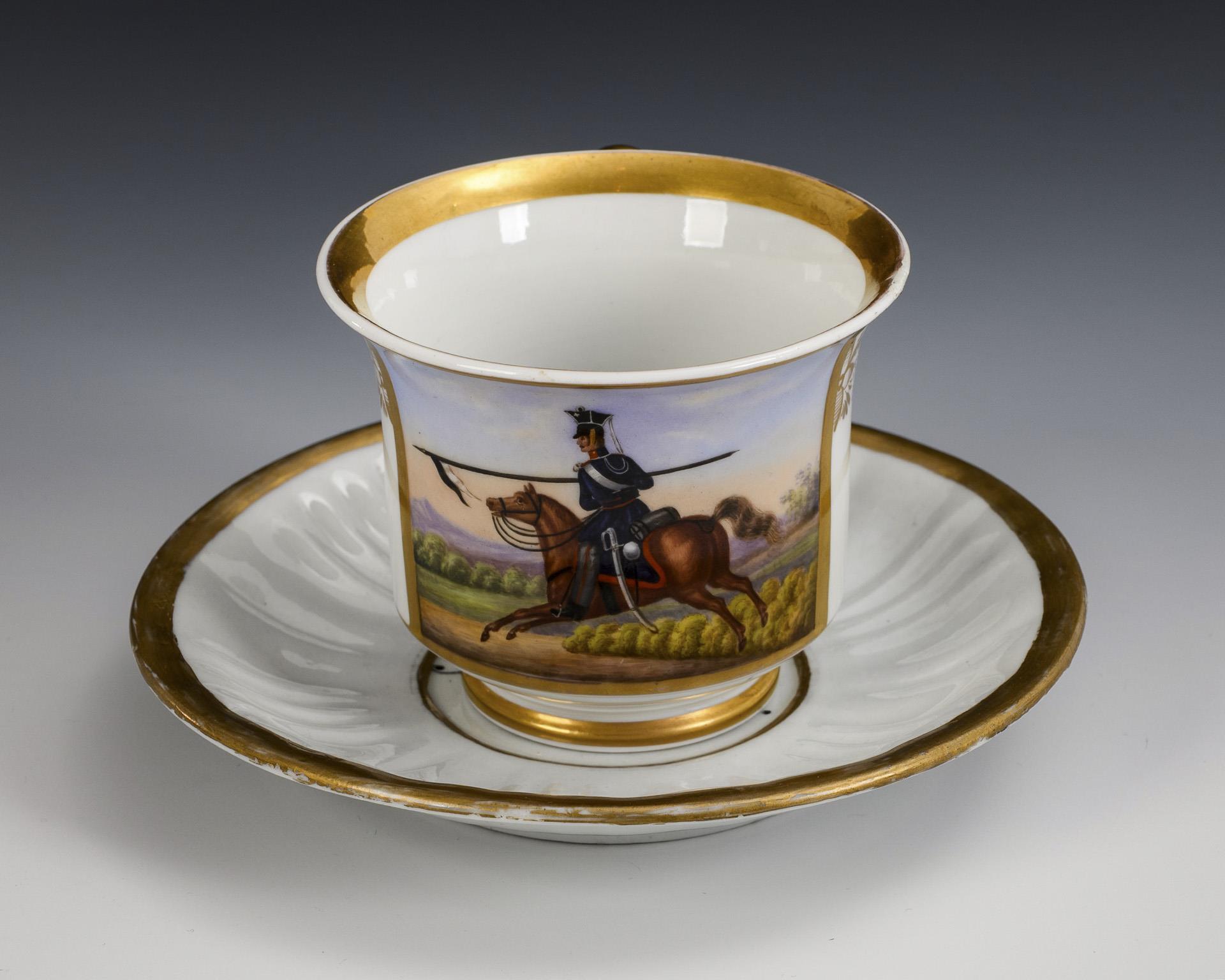 Gefußte Glockentasse mit Ohrenhenkel. Schauseitig eine goldgerahmte Rechteckkartusche mit der Darstellung eines Dragoners zu Pferd