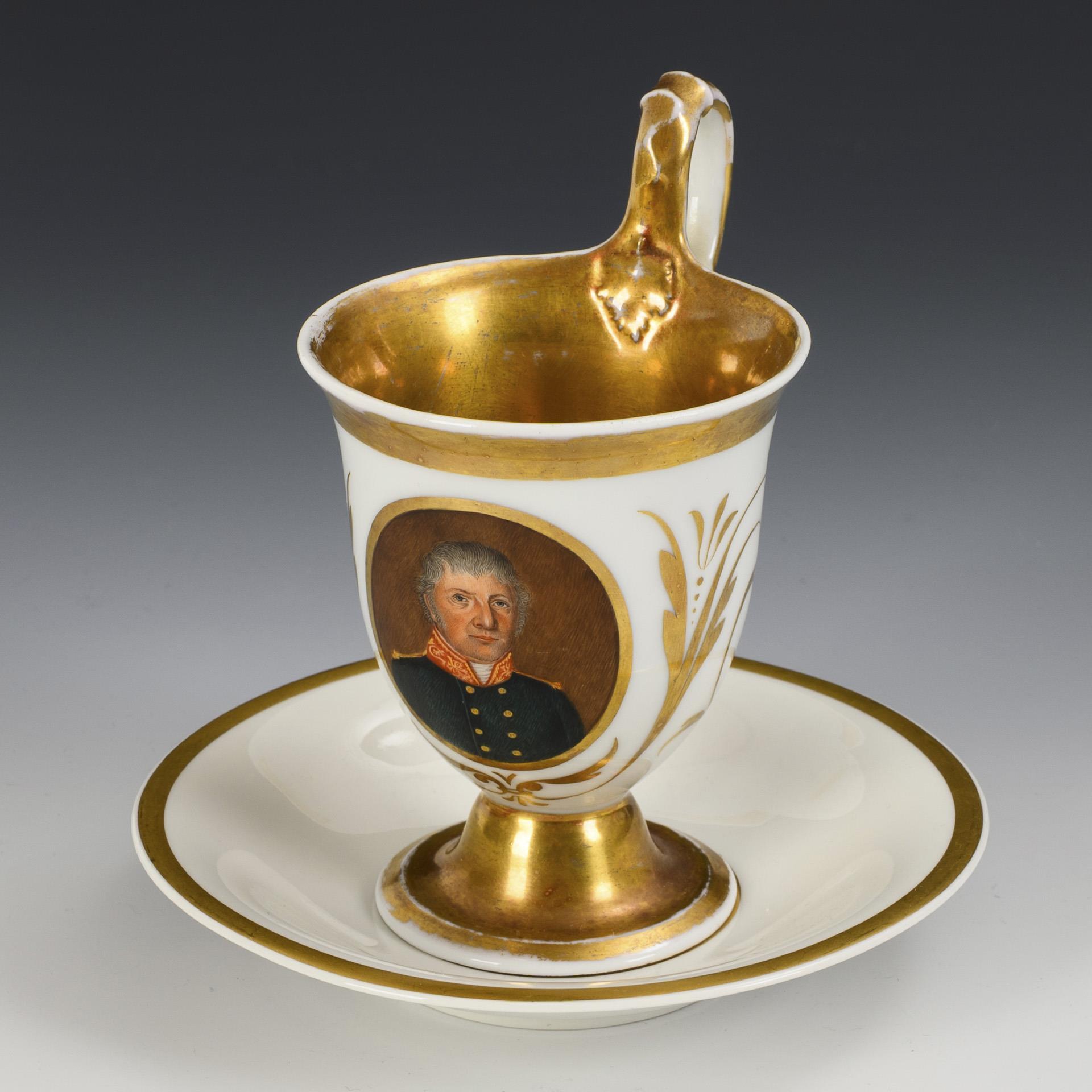 Gefußte Glockentasse mit Weinblatthenkel. Schauseitig ein goldgerahmtes Ovalmedaillon mit dem Bildnis eines Herren in Uniform