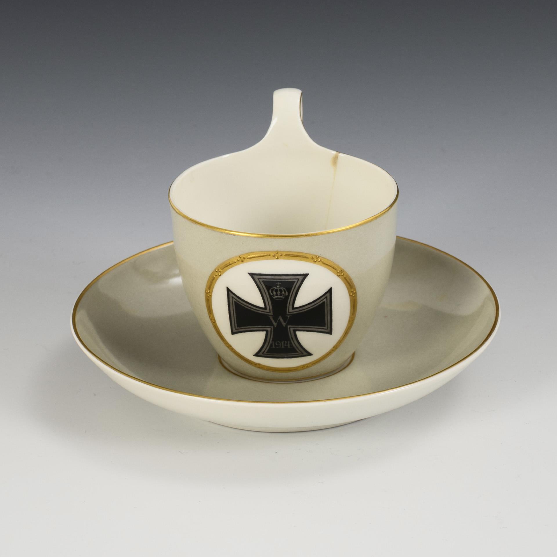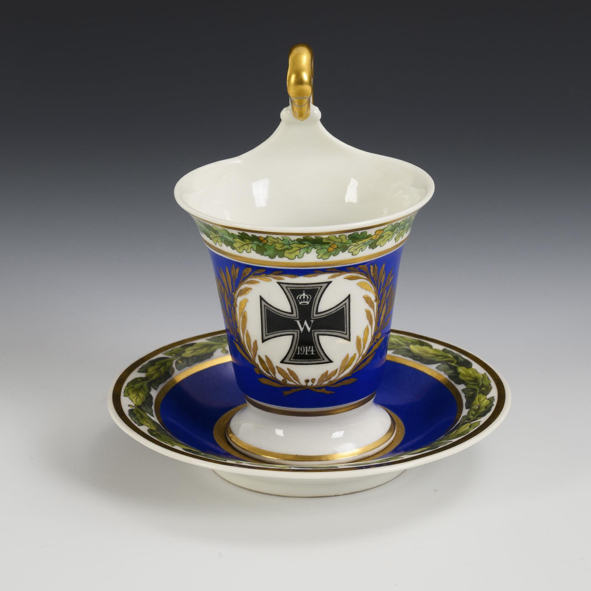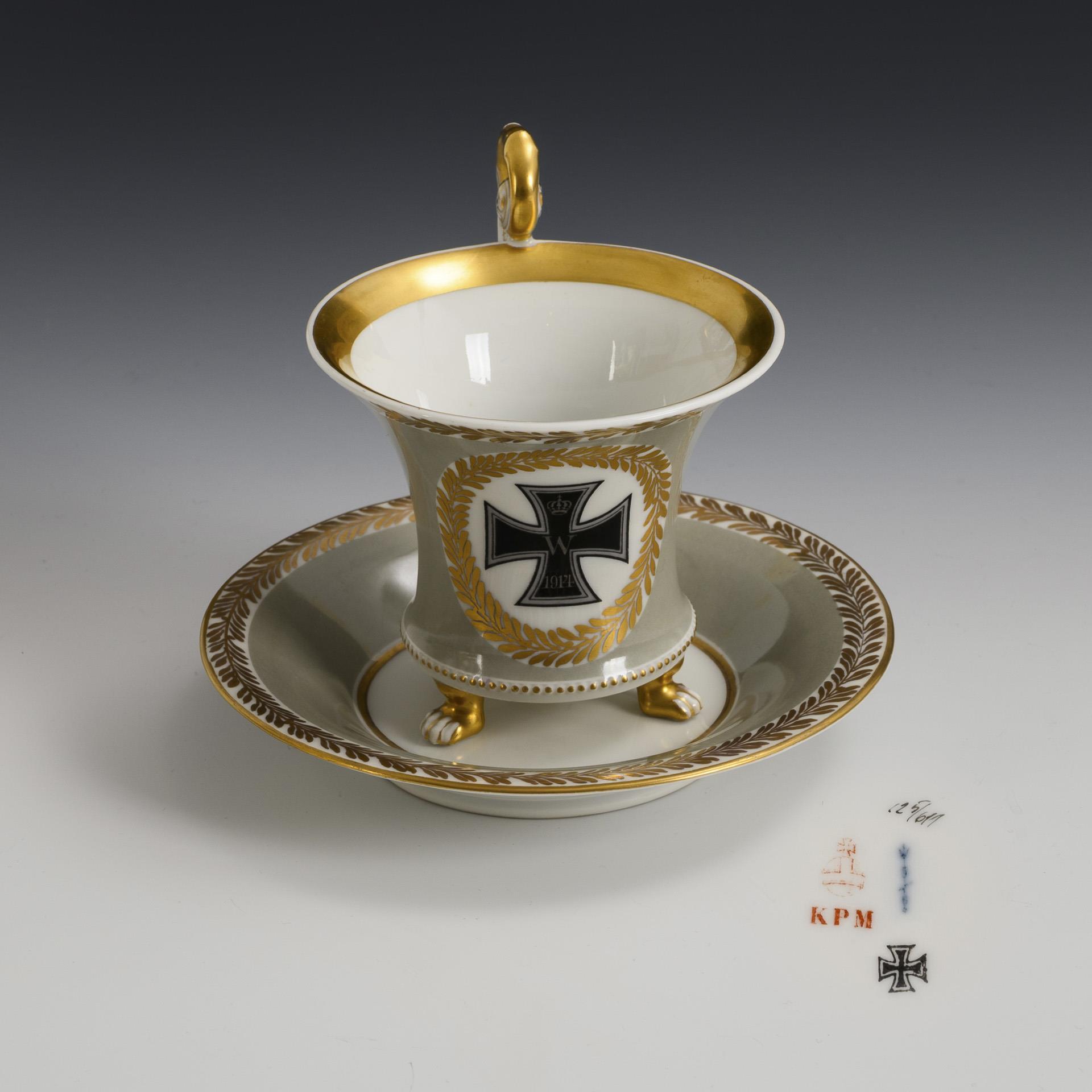 Gefußte Kratertasse mit Schwanenhenkel. Eichenlaubbordüre, blauer Fond sowie schauseitig das Eiserne Kreuz mit der Jahreszahl "1914". Im Spiegel der Untertasse die Darstellung einer Quadriga mit der Bezeichnung "Paris, 3. Maerz, 1814"