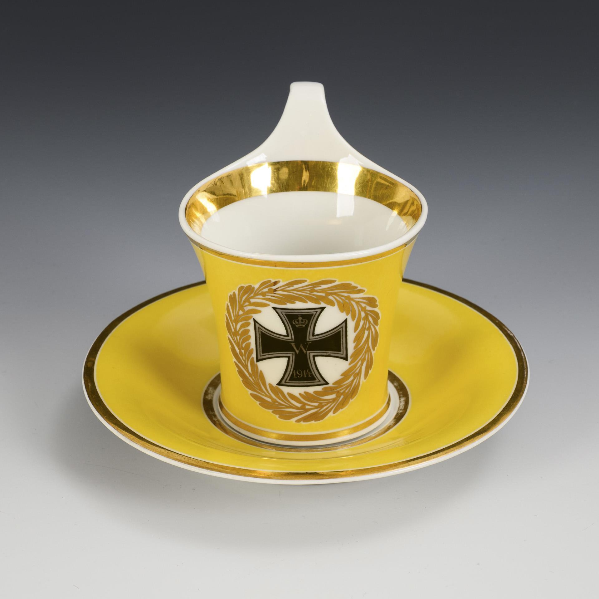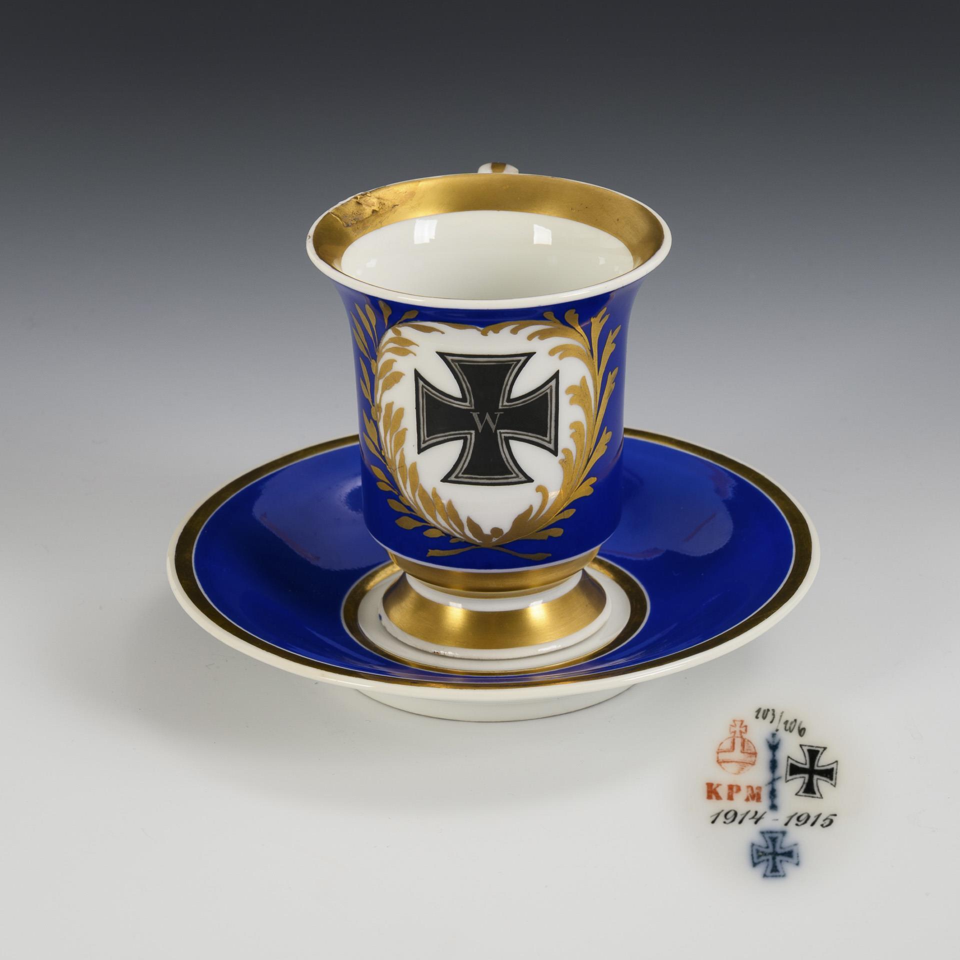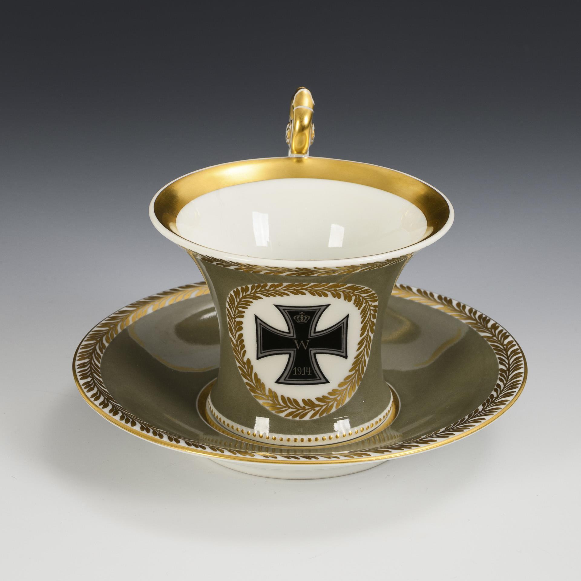 Gefußte Kratertasse mit Schwanenhenkel. Eichenlaubbordüre, blauer Fond sowie schauseitig das Eiserne Kreuz mit der Jahreszahl "1914". Im Spiegel der Untertasse die Darstellung einer Quadriga mit der Bezeichnung "Paris, 3. Maerz, 1814"