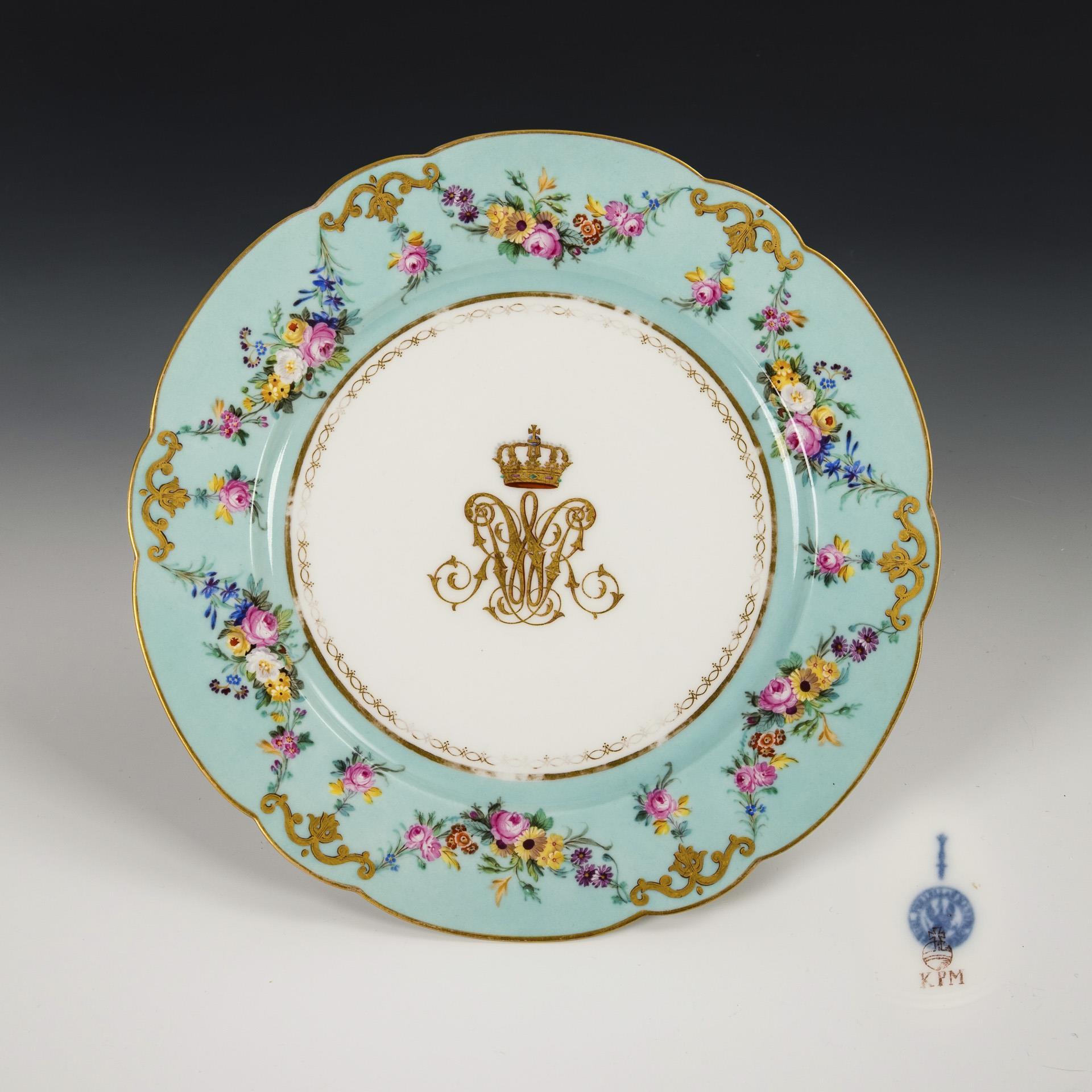 Farbig bemalt, gold staffiert. Pressmarken, blaue Zeptermarken, rote Reichsapfelmarken, Malermarken von Pfeifer, eine schwarze Kriegsmarke 1914-1918