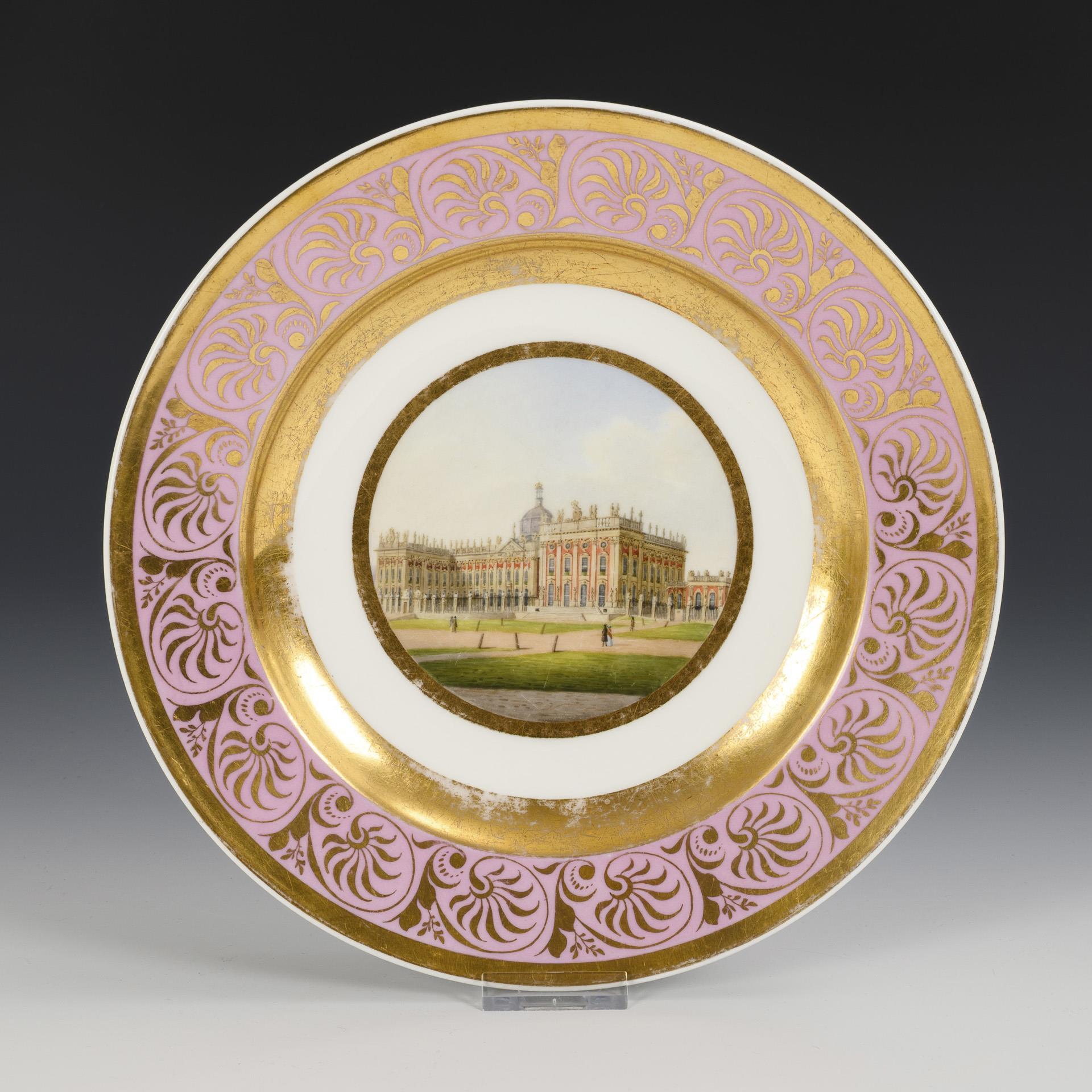 Im Spiegel ein Medaillon mit der unterseitig bezeichneten Ansicht des Neuen Palais bei Potsdam, vegetabile goldene Mäanderbordüre auf dem rosa Fahnenfond