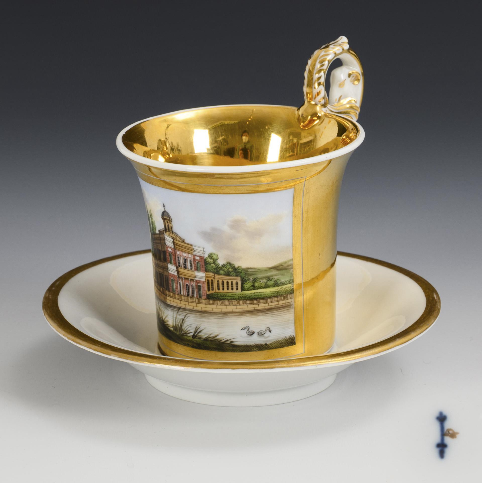Kratertasse mit abgesetztem Fuß und Ohrenhenkel. In einer goldgerahmten Rechteckkartusche die bezeichnete Darstellung des Marmorpalais in Potsdam, verso vegetabile Bordüren, innen vergoldet