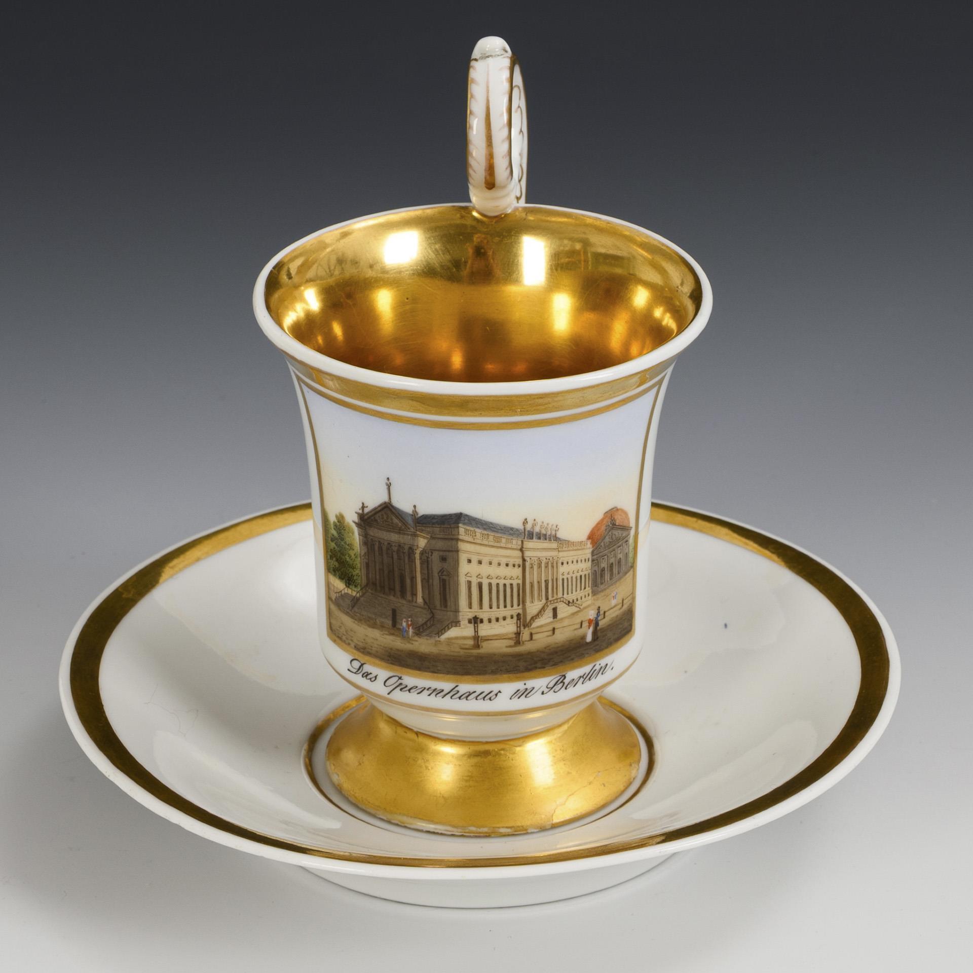 Gefußte Glockentasse mit Palmettenhenkel. In einer goldgerahmten Rechteckkartusche die bezeichnete Darstellung des Opernhauses in Berlin, dahinter die Sankt Hedwigs-Kathedrale. Innen vergoldet