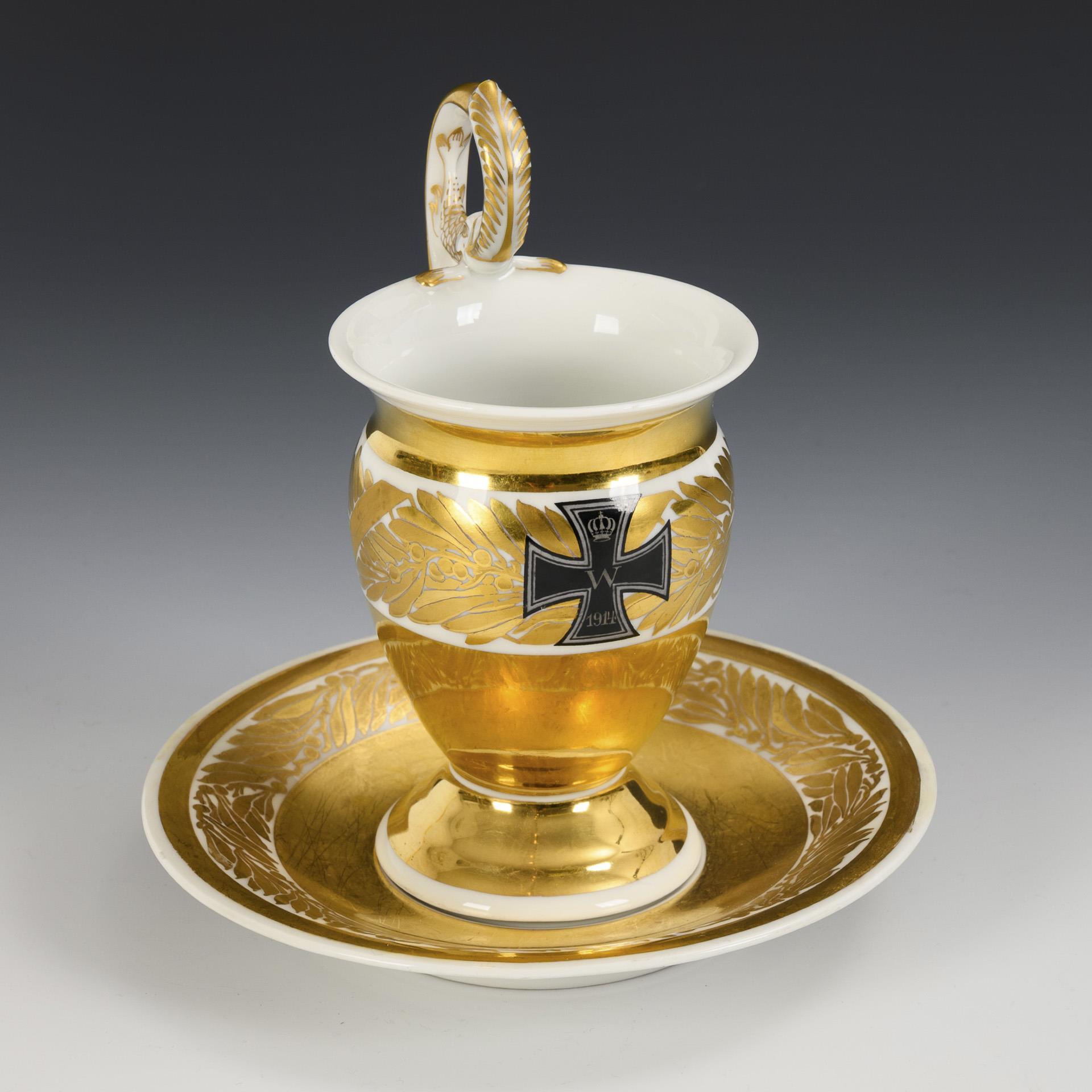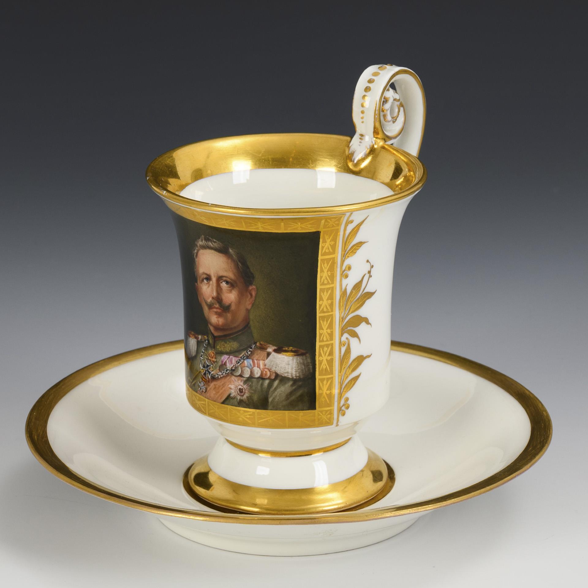 Zylindrische Tasse mit Kraterrand, Rosettenhenkel und drei Tatzenfüßen. Schauseitig ein goldenes, würmelbandgraviertes Medaillon mit dem Biskuitporträt Kaiser Wilhelm II. (1859-1941), unterglasurblauer Teilfond mit reicher ornamental-vegetabiler Goldreliefmalerei, im Spiegel der Untertasse das Monogramm WR II für Kaiser Wilhelm II.