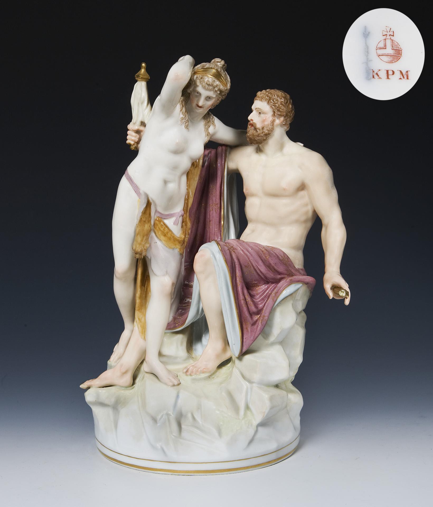 Herkules erschlug in einem von seiner Feindin Hera verursachten Anfall von Verwirrung einen Gastfreund, als Sühne musste er sich in die Sklaverei begeben, so lebte er drei Jahre im Dienste von Omphale, wurde zu Frauenarbeiten gezwungen und zeugte mit ihr mehrere Söhne. Farbig bemalt, gold staffiert. Ritzmarke, Pressmarke, blaue Zeptermarke, rote Reichsapfelmarke, Malermarken von Pfeifer und Limpig