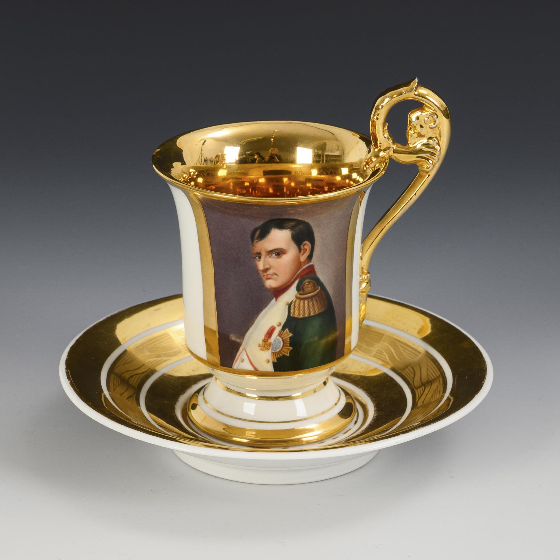 Gefußte Glockentasse mit Widderkopfhenkel. In einer goldgerahmten Rechteckkartusche des Bildnis Napoleon Bonapartes, innen vergoldet