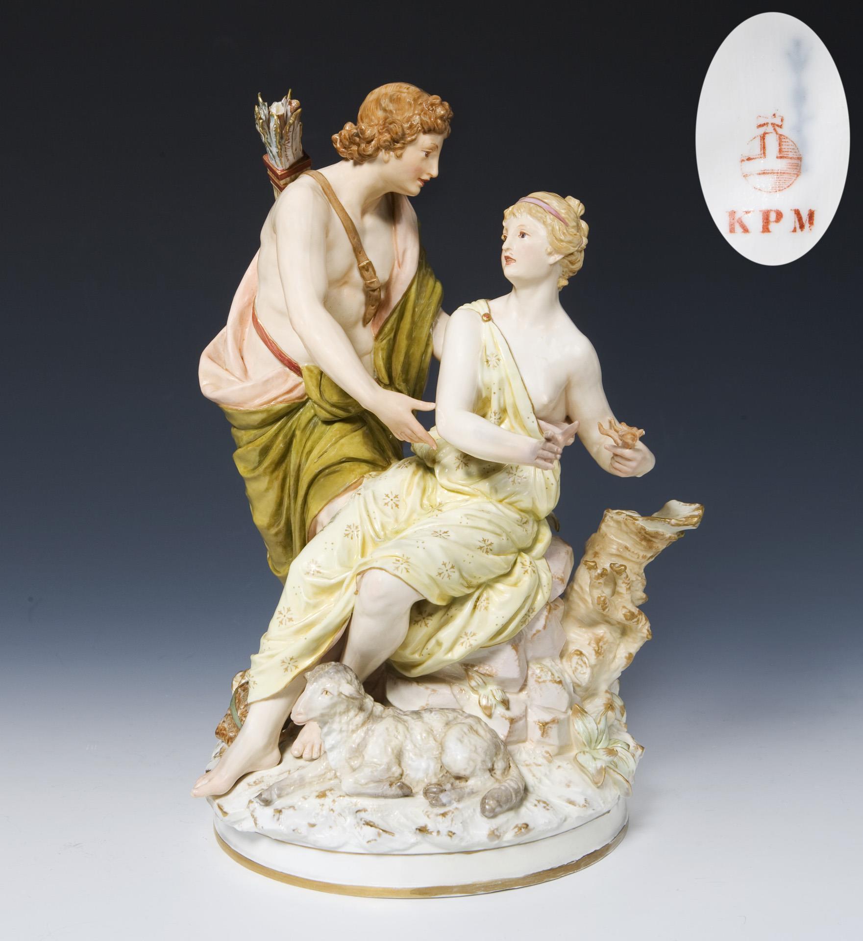 Apollo, der strahlende Gott des Lichts, des Frühlings, der Künste und der Heilkunst, Dryope, Geliebte des Apollo. Farbig bemalt, gold staffiert. Pressmarke, blaue Zeptermarke, rote Reichsapfelmarke, Malermarke