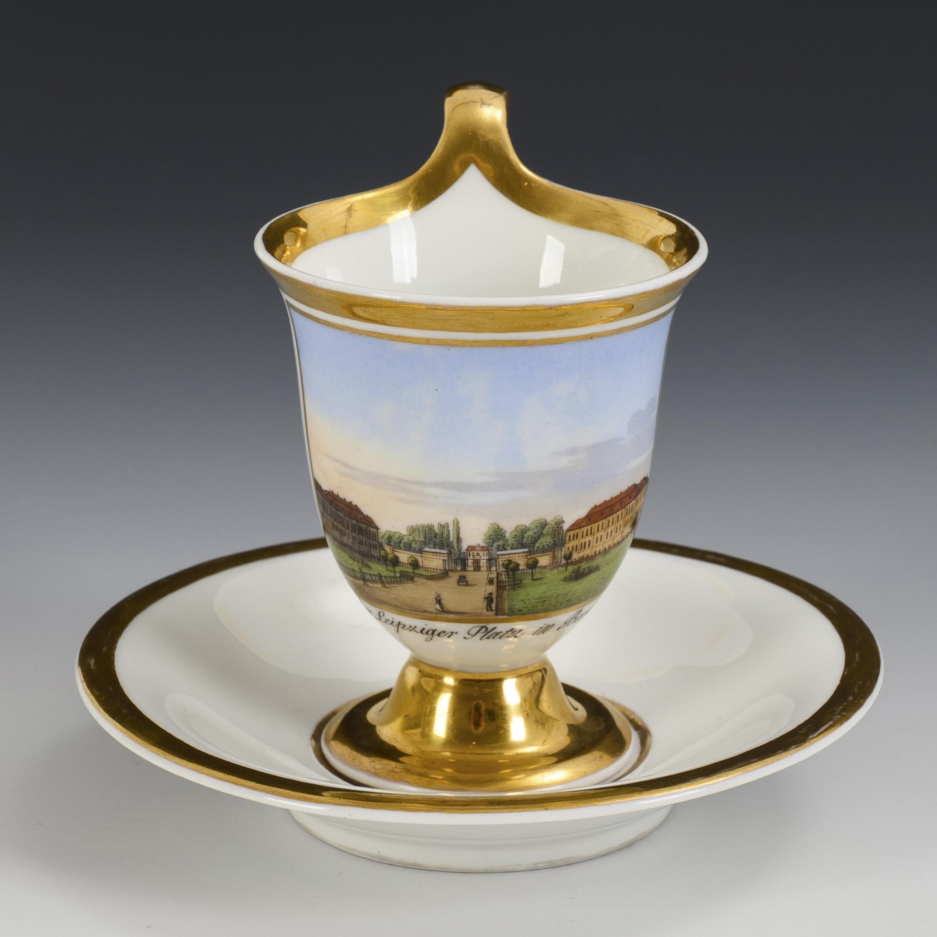 Gefußte Glockentasse mit Campanerhenkel. In einer goldgerahmten Kartusche die bezeichnete Ansicht des 1814 nach der Völkerschlacht bei Leipzig benannten, achteckigen Platzes