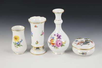 3 Vasen und 1 Dose. Meissen.
