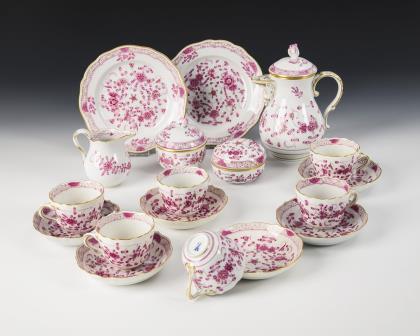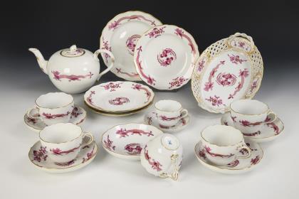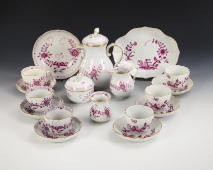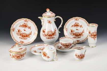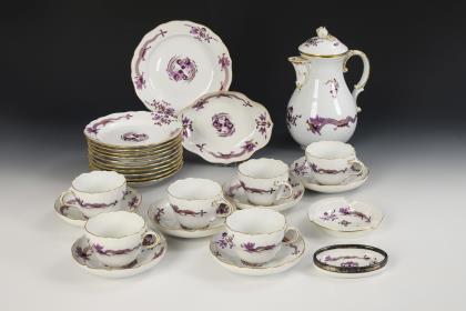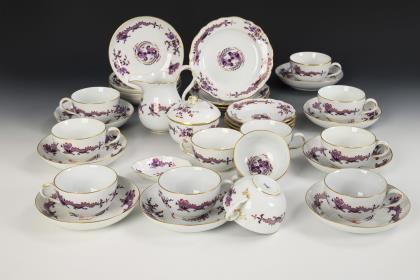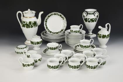 44 Teile. Überwiegend Form "Neuer Ausschnitt". Kaffeekanne (H 23,5 cm), Teekanne (H 12 cm), Wasserkrug (H 15,5 cm), Milchkännchen, Zuckerdose, 8 Kaffeetassen mit 8 Untertassen, 6 Teetassen mit 5 + 1 Untertassen, 6 Kuchenteller, 1 Durchbruchtafelaufsatz (H 7,5 cm), 1 Durchbruchteller (Ø 28,5 cm), 1 Durchbruchschale (L 30,5 cm), 1 Untersetzer und 1 Tablett (L 23 cm)