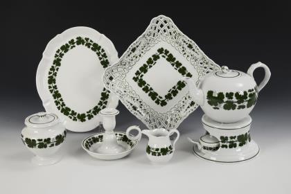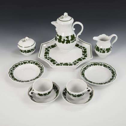 59 Teile. Reliefdekor "Gebrochener Stab". Kaffeekanne (H 24,5 cm), Teekanne (H 15 cm), 2 Milchkännchen, 1 Zuckerdose, 8 Kaffeetassen mit 10 Untertassen, 5 Teetassen mit 5 Untertassen, 12 Frühstücksteller, 2 Suppenteller, 2 Desserteller, 2 Beilagenteller, 3 Kompottschälchen, 3 Kuchenteller (Ø 28,5 cm), 1 Schale (Ø 22 cm) und 1 Blattschale (L 19,5 cm)