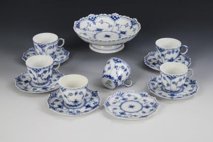 6 Mokkatassen und 1 Tafelaufsatz "Musselmalet Vollspitze". Royal Copenhagen.