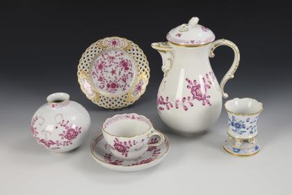 4 Teile: Tablett, Tintenfass, Sandstreuer, Stiftebecher. Kobaltblaue Unterglasurmalerei, korallenrot und gold schattiert, gold staffiert, "Indisch-Blumen- und Vogeldekor". Malermarken, Schwertermarken