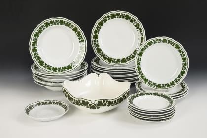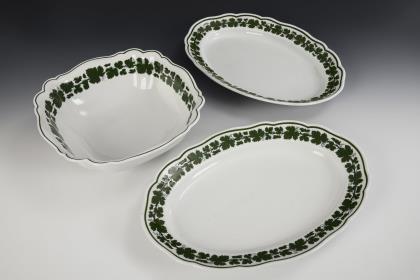 35 Teile. Form "Altozier". 11 Suppenteller, 11 + 3 Speiseteller, 2 Fächerschalen (Ø 17 und 20 cm), 2 verschiedene Saucieren (L 22 und 22,5 cm), 1 Deckelschüssel (L 28 cm), 2 runde Schalen (Ø 19 und 21,5 cm) und 3 Ovalplatten (L 33,5, 36,5 und 40,5 cm)