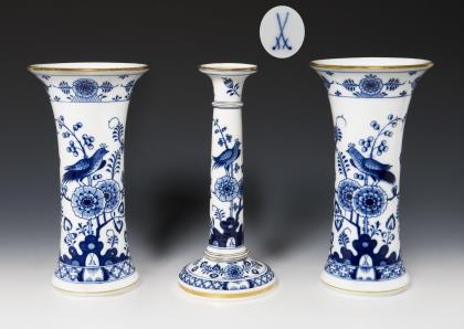 Leuchter Form-Modell von Johann Gottfried Dressler und Mitarbeiter, Modell-Jahr: 1816-1818, Vasen-Form-Modell von Carl Gotthelf Habenicht und Mitarbeiter, Modell-Jahr: 1844-1847. Kobaltblaue Unterglasurmalerei, gold staffierte Ränder, "Indisch-Blumen- und Vogeldekor". Ritzmarken, Malermarken, Schwertermarken