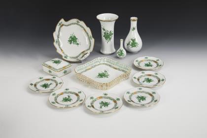 Überwiegend Form "Altozier". 6 Teller Dekor "Apponyi grün" (Ø 16,5 cm), 2 Teller Dekor "Apponyi orange" (Ø 21 cm), 1 Dessertschale mit Garbenmuster und Erdbeerknaufdeckel (L 19,5 cm), 1 Zuckerstreuer mit Rothschilddekor (H 12 cm) und 1 Tablett (L 49,5 cm)