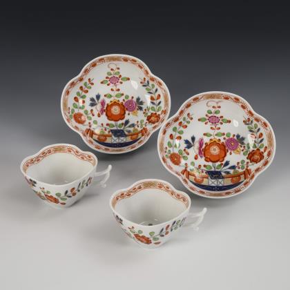 Form "Neuer Ausschnitt", kobaltblaue Unterglasurmalerei, korallenrot und gold schattiert, gold staffiert, "Zwiebelmusterdekor". Malermarken, Schwertermarken