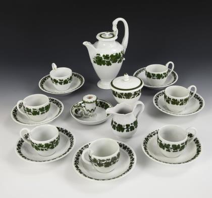 23 Teile. Form "Neuer Ausschnitt". Mokkakanne (H 16,5 cm), Milchkännchen, Zuckerdose, 6 Mokkatassen mit 6 Untertassen, 6 Gebäckteller, 1 Kratervase (H 11 cm) und 1 Schale (Ø 15 cm)