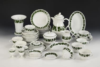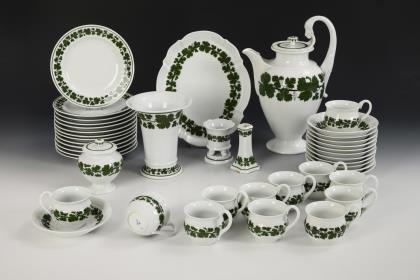 77 Teile. Kaffeekanne (H 24,5 cm), Teekanne (H 17,5 cm), 2 Milchkännchen (H 9,5 und 11,5 cm), 2 Zuckerdosen, 12 Kaffeetasse mit 12 Untertassen, 10 Teetassen mit 10 Untertassen, 12 Kuchenteller, 12 Frühstücksteller, 1 Vase (H 18 cm), 1 Kredenzteller (Ø 31 cm) und 1 Kerzenleuchter (H 5,5 cm)