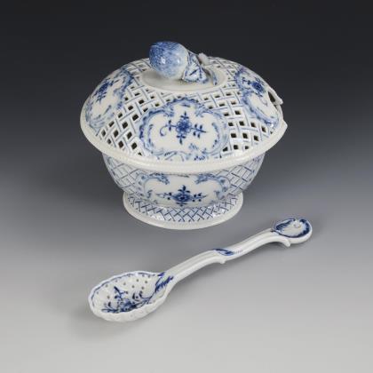 Ovale Fußschale mit durchbrochenem Erdbeerknaufdeckel und Sieblöffel