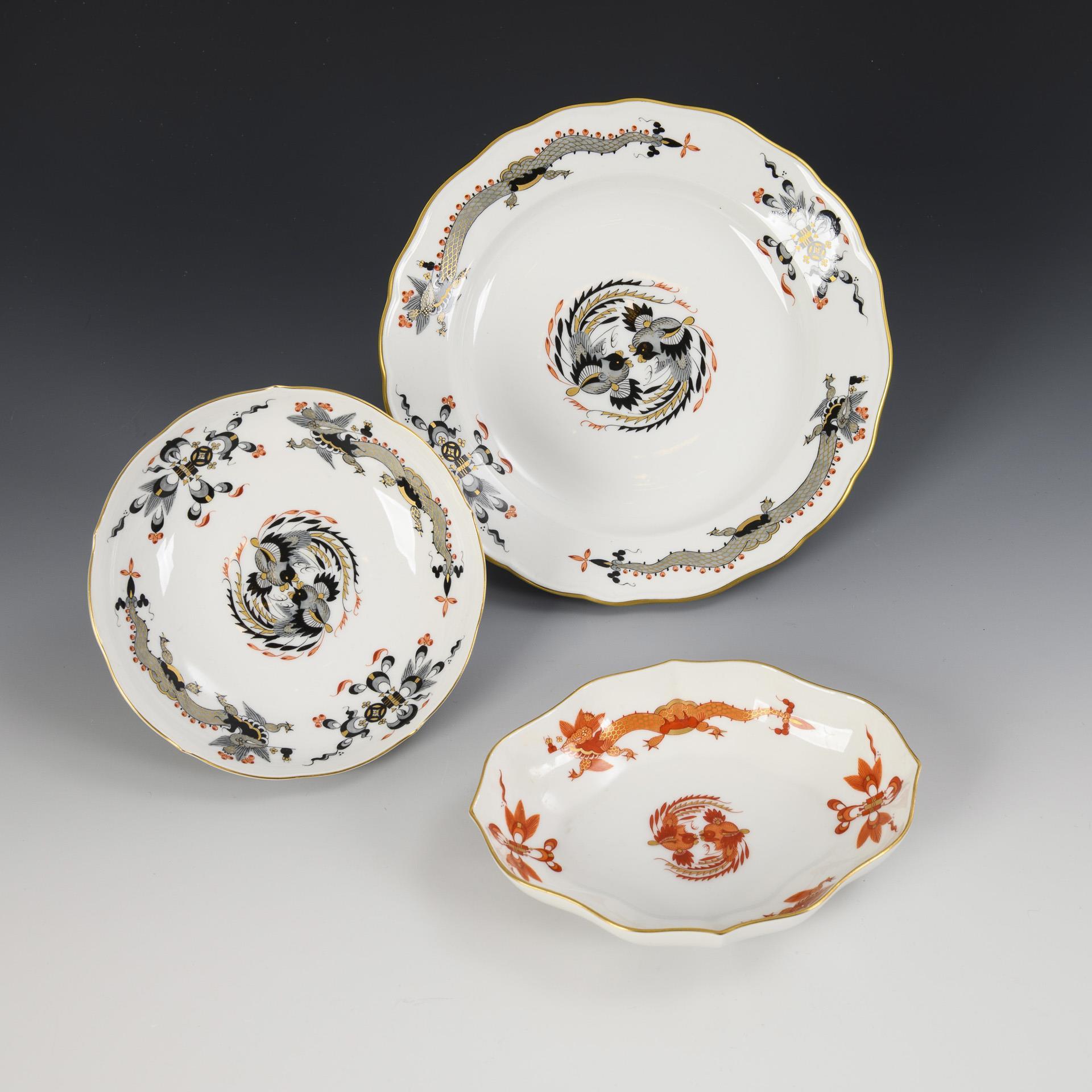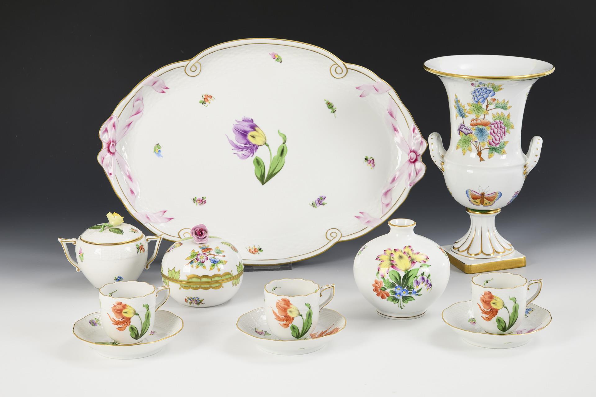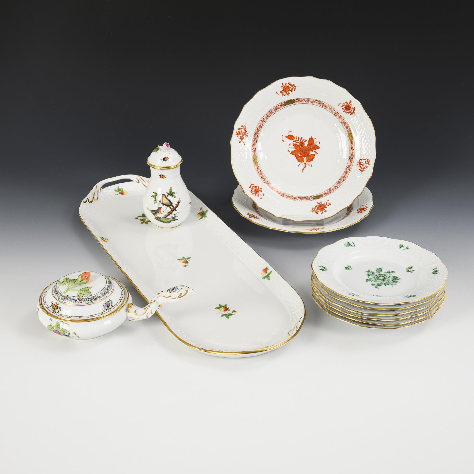 Überwiegend Form "Altozier". 6 Teller Dekor "Apponyi grün" (Ø 16,5 cm), 2 Teller Dekor "Apponyi orange" (Ø 21 cm), 1 Dessertschale mit Garbenmuster und Erdbeerknaufdeckel (L 19,5 cm), 1 Zuckerstreuer mit Rothschilddekor (H 12 cm) und 1 Tablett (L 49,5 cm)
