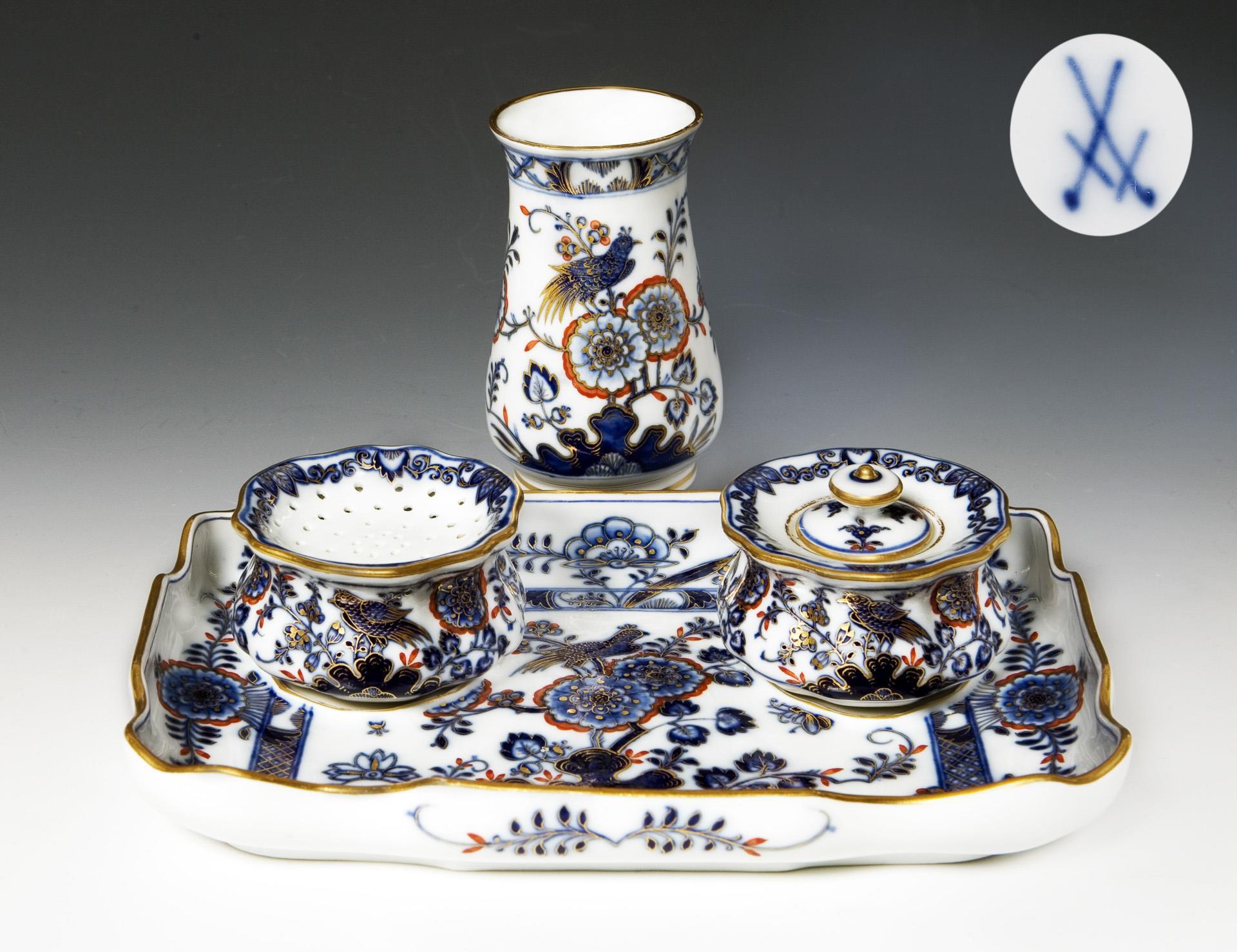 4 Teile: Tablett, Tintenfass, Sandstreuer, Stiftebecher. Kobaltblaue Unterglasurmalerei, korallenrot und gold schattiert, gold staffiert, "Indisch-Blumen- und Vogeldekor". Malermarken, Schwertermarken