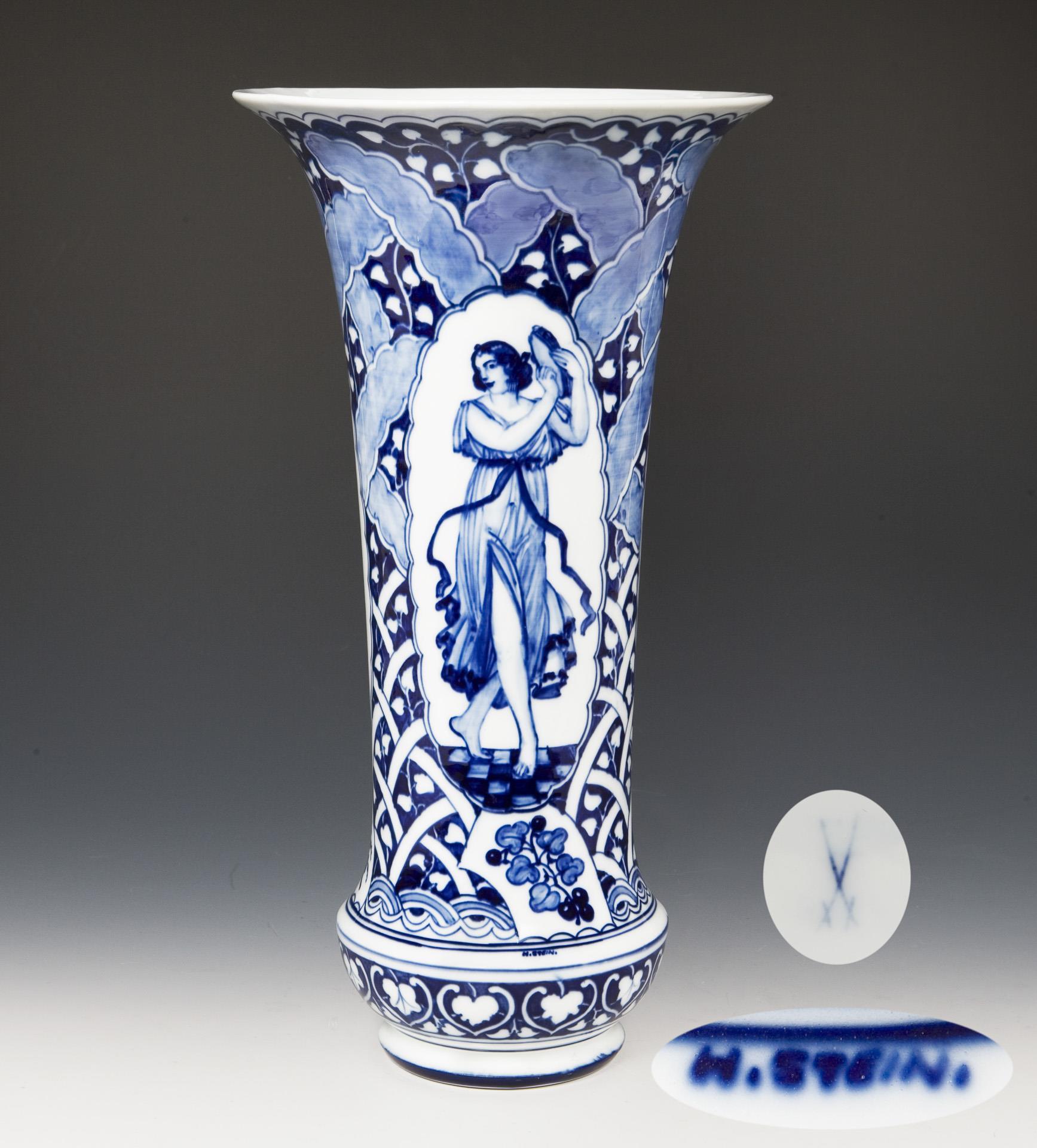 Form-Modell von Georg Fritzsche nach ostasiatischem Vorbild. Dekor von Hugo Stein (1881-1930). Modell-Jahr: 1726 (Form). Flächendeckend kobaltblaue Unterglasurmalerei, umlaufend zwischen großzügig angelegtem ornamentalem Fond drei Reserven: Musen mit Lyra, Theater-Maske und Tamburin. Pressmarke, Schwertermarke mit Punkt, frontal Künstler-Signet