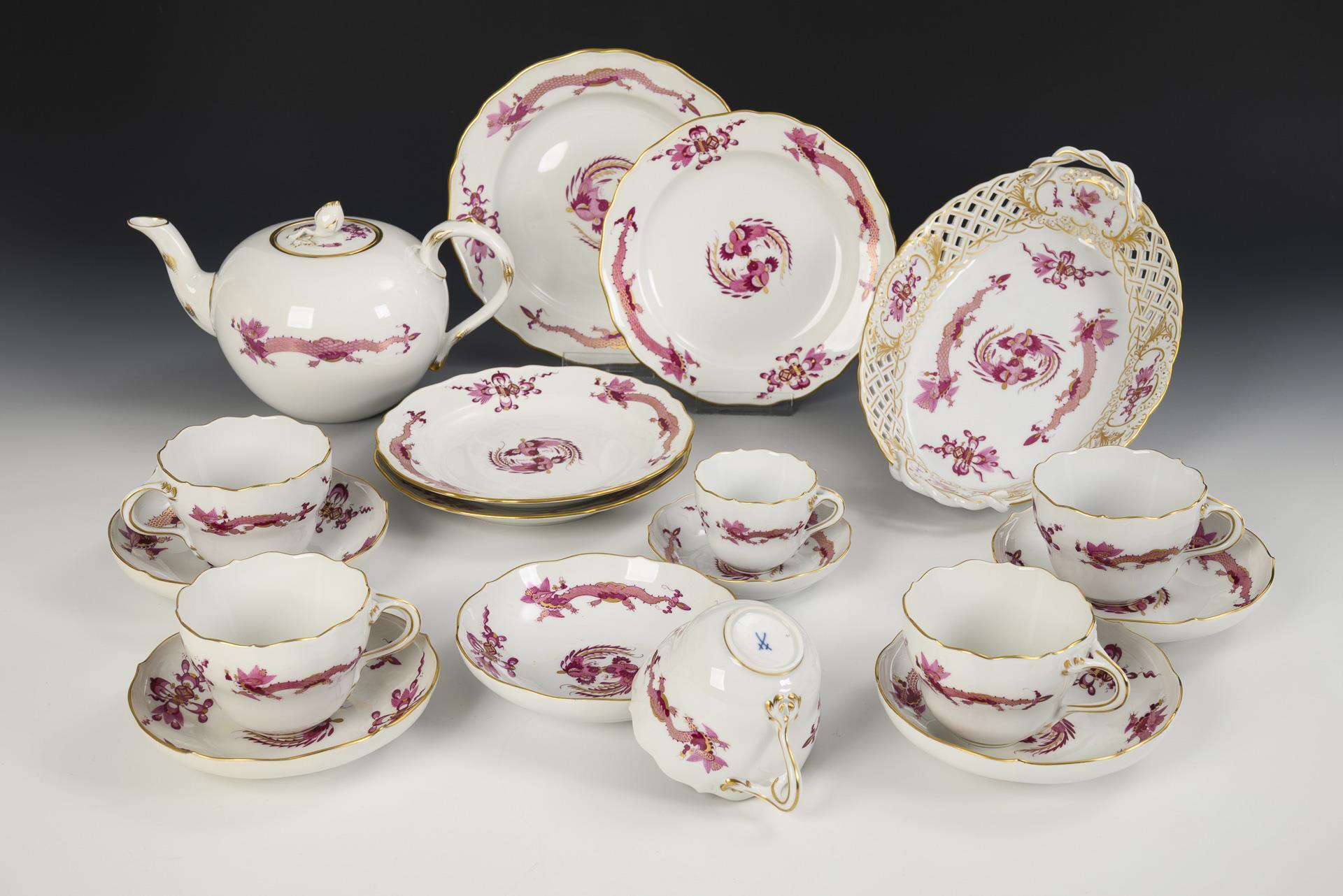 44 Teile. Überwiegend Form "Neuer Ausschnitt". Kaffeekanne (H 23,5 cm), Teekanne (H 12 cm), Wasserkrug (H 15,5 cm), Milchkännchen, Zuckerdose, 8 Kaffeetassen mit 8 Untertassen, 6 Teetassen mit 5 + 1 Untertassen, 6 Kuchenteller, 1 Durchbruchtafelaufsatz (H 7,5 cm), 1 Durchbruchteller (Ø 28,5 cm), 1 Durchbruchschale (L 30,5 cm), 1 Untersetzer und 1 Tablett (L 23 cm)