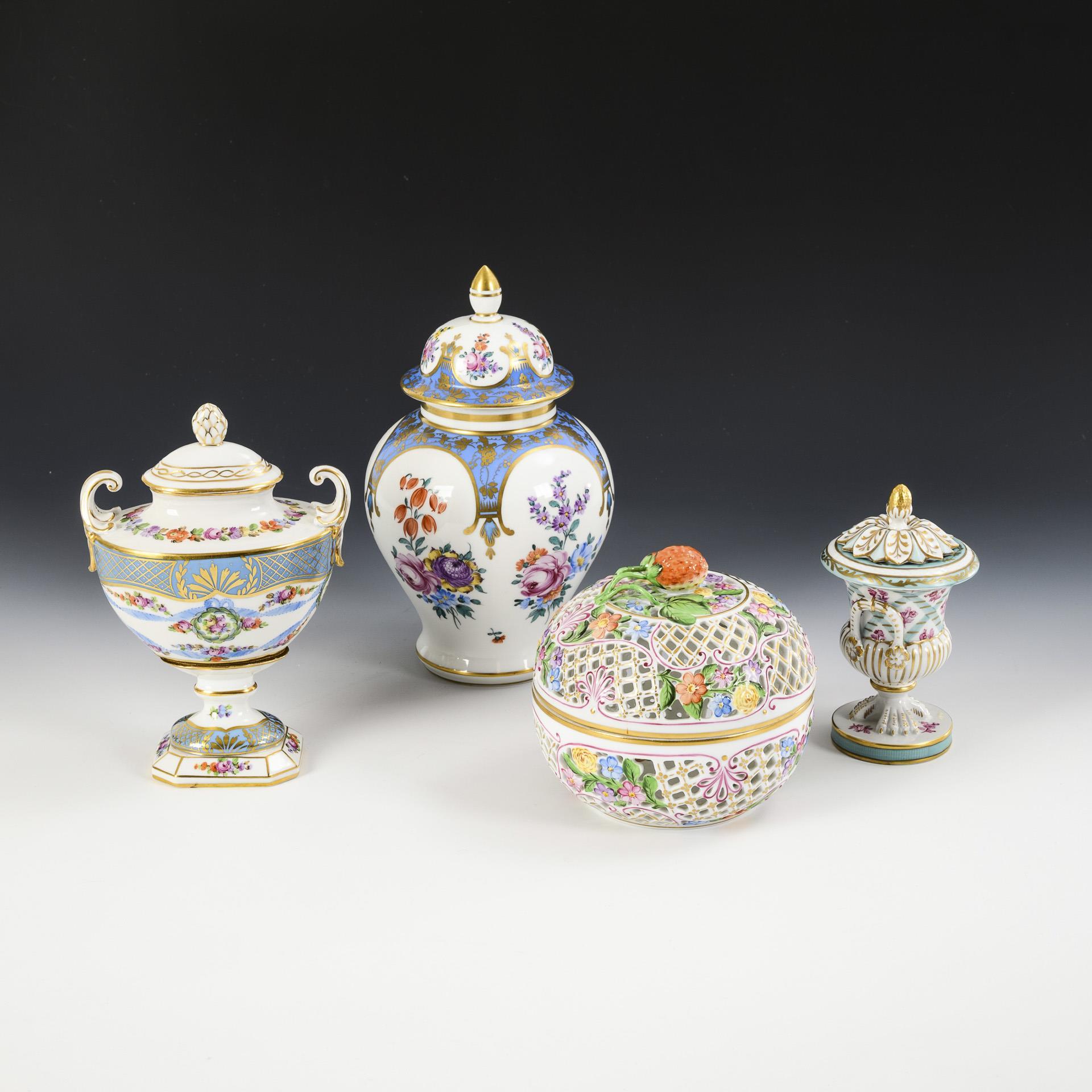 3 Deckelvasen Potschappel und und 1 Potpourridose Herend.