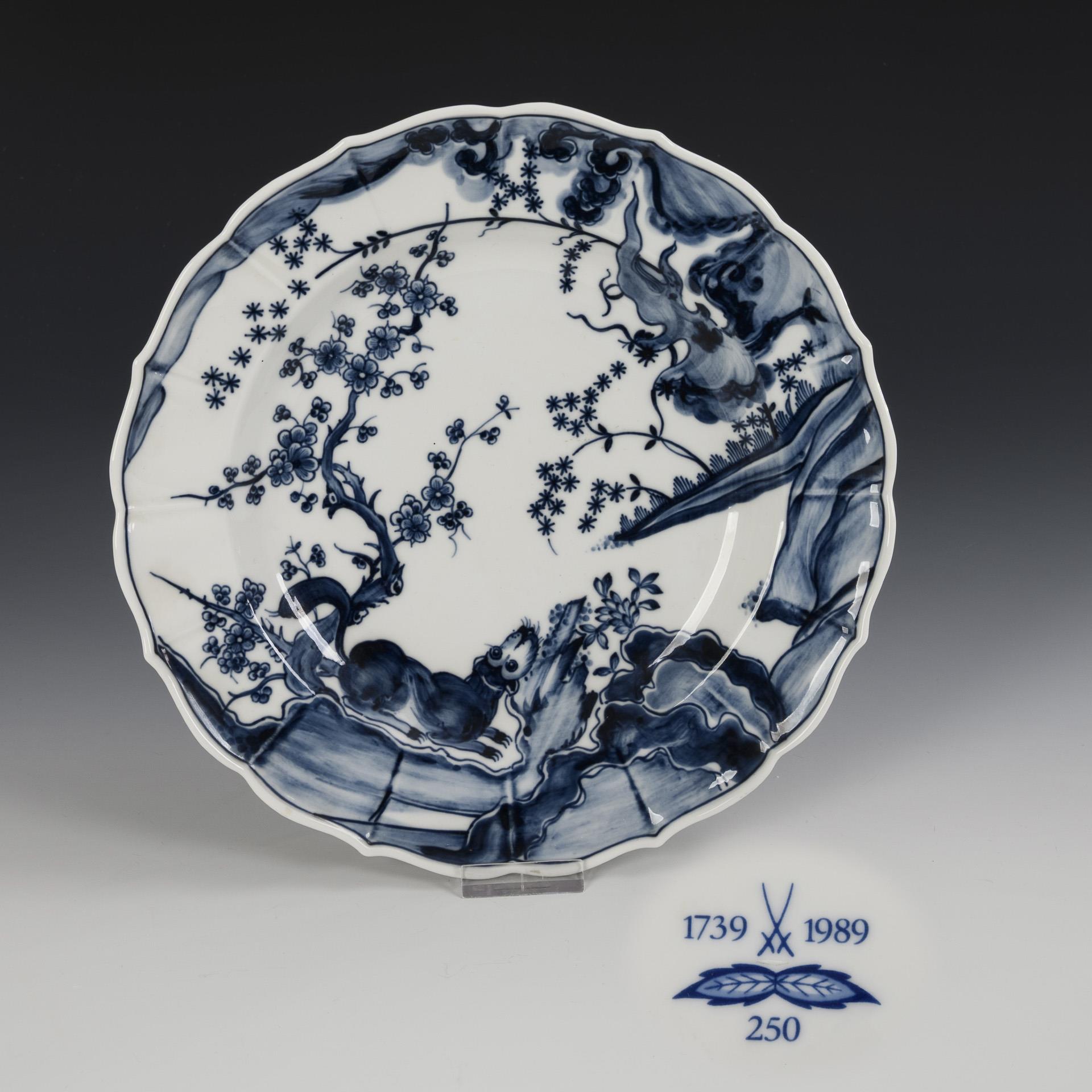 Form "Neuer Ausschnitt", kobaltblaue Unterglasurmalerei, korallenrot und gold schattiert, gold staffiert, "Zwiebelmusterdekor". Malermarken, Schwertermarken