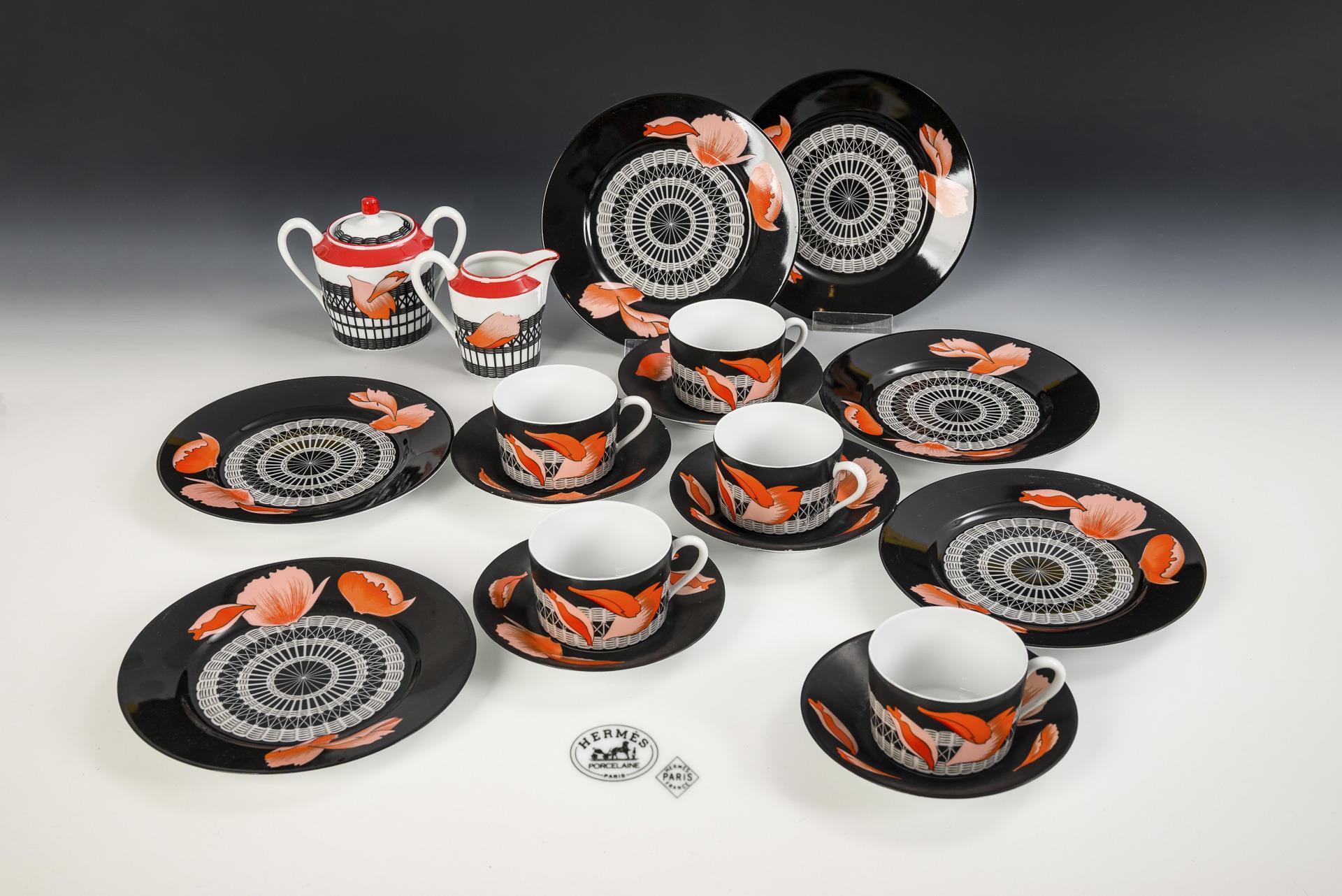 60 Teile. Form "Chrysantheme". Kaffeekanne (H 24 cm), Milchkännchen, Zuckerdose, Konfitürendose, 9 Tassen, 12 Untertassen, 12 Kuchenteller, 6 Eierbecher, 8 Beilagentellerchen (Ø 10,5 cm), 6 Beilagentellerchen mit dem Dekor "Viktoria-Luise", 1 Kredenzteller (Ø 31 cm), 1 Ovalschale (L 31,5 cm) und 1 Vase (H 17,5 cm)