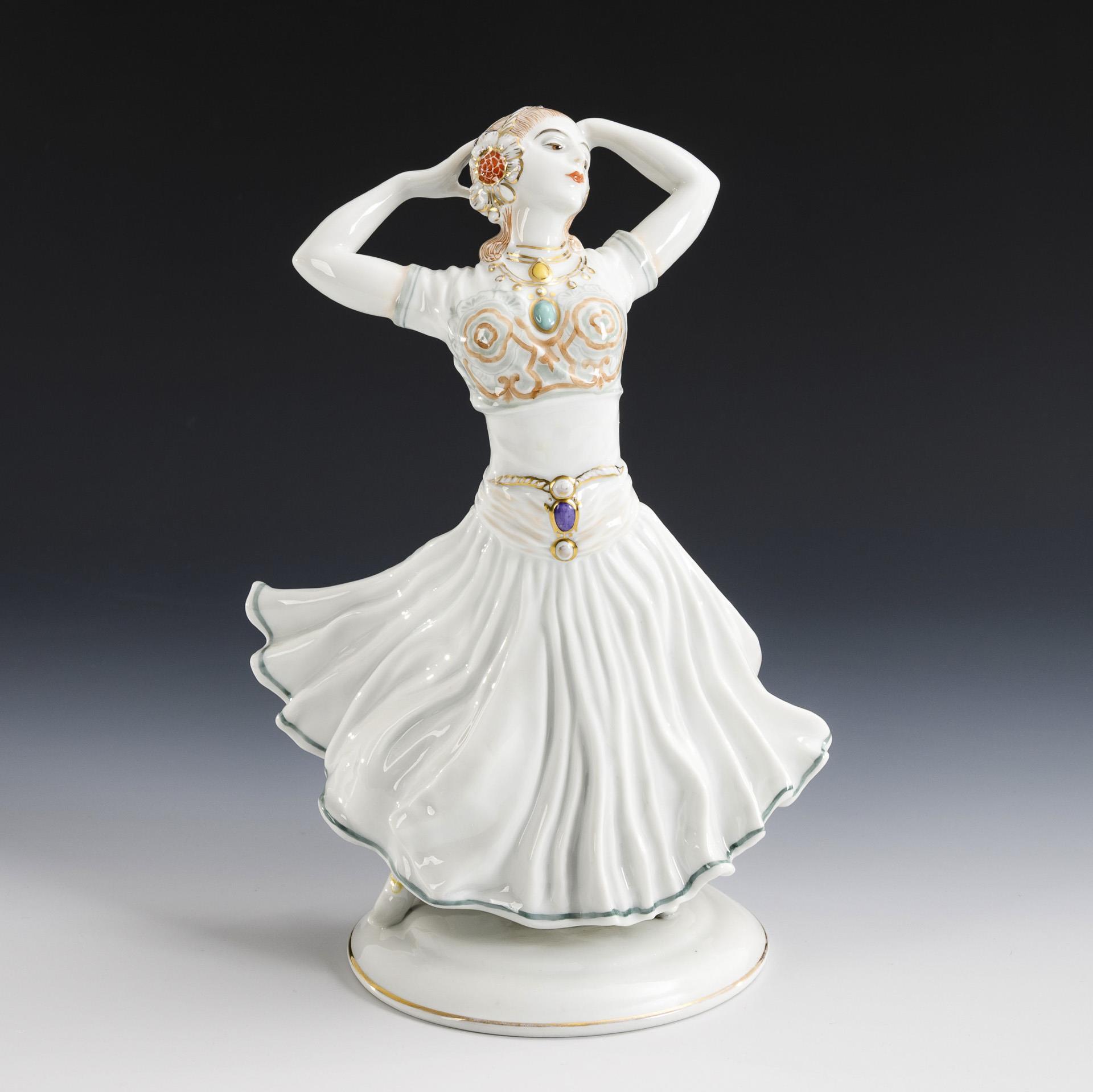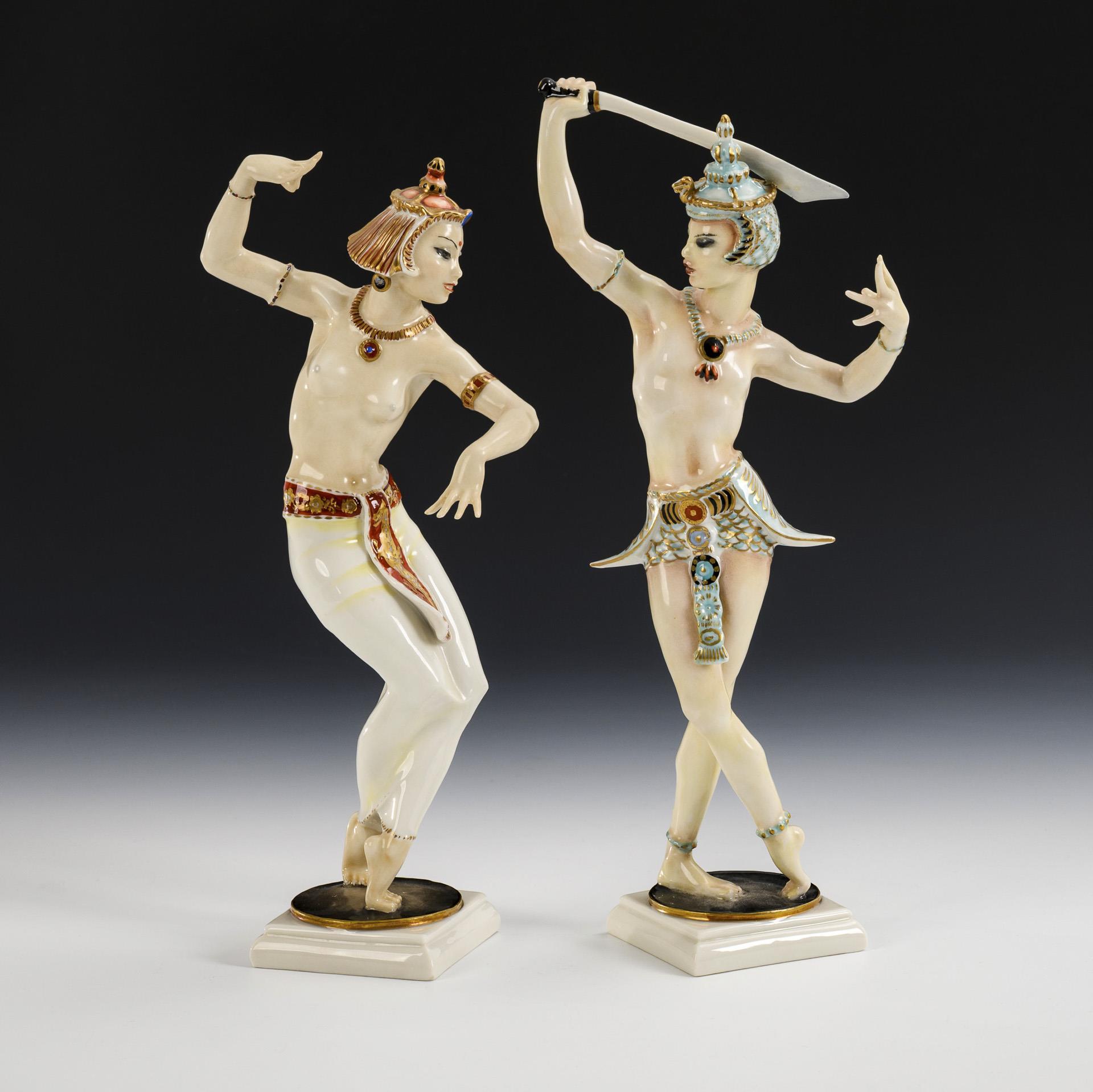 1x "Nubische Tänzerin", Modell-Nr. K 358, Entwurf 1914 von Berthold Boeß (1877-1957): auf ovaler Plinthe stehende Ausdruckstänzerin im langen Rock und Schleier. / 1x "Gebetstänzerin", Modell-Nr. 961, Entwurf 1927 von Gustav Oppel (1891-1978): orientalisch gekleidete Tänzerin in ausdrucksvoller Pose, die Hände erhebend, auf Rundplinthe