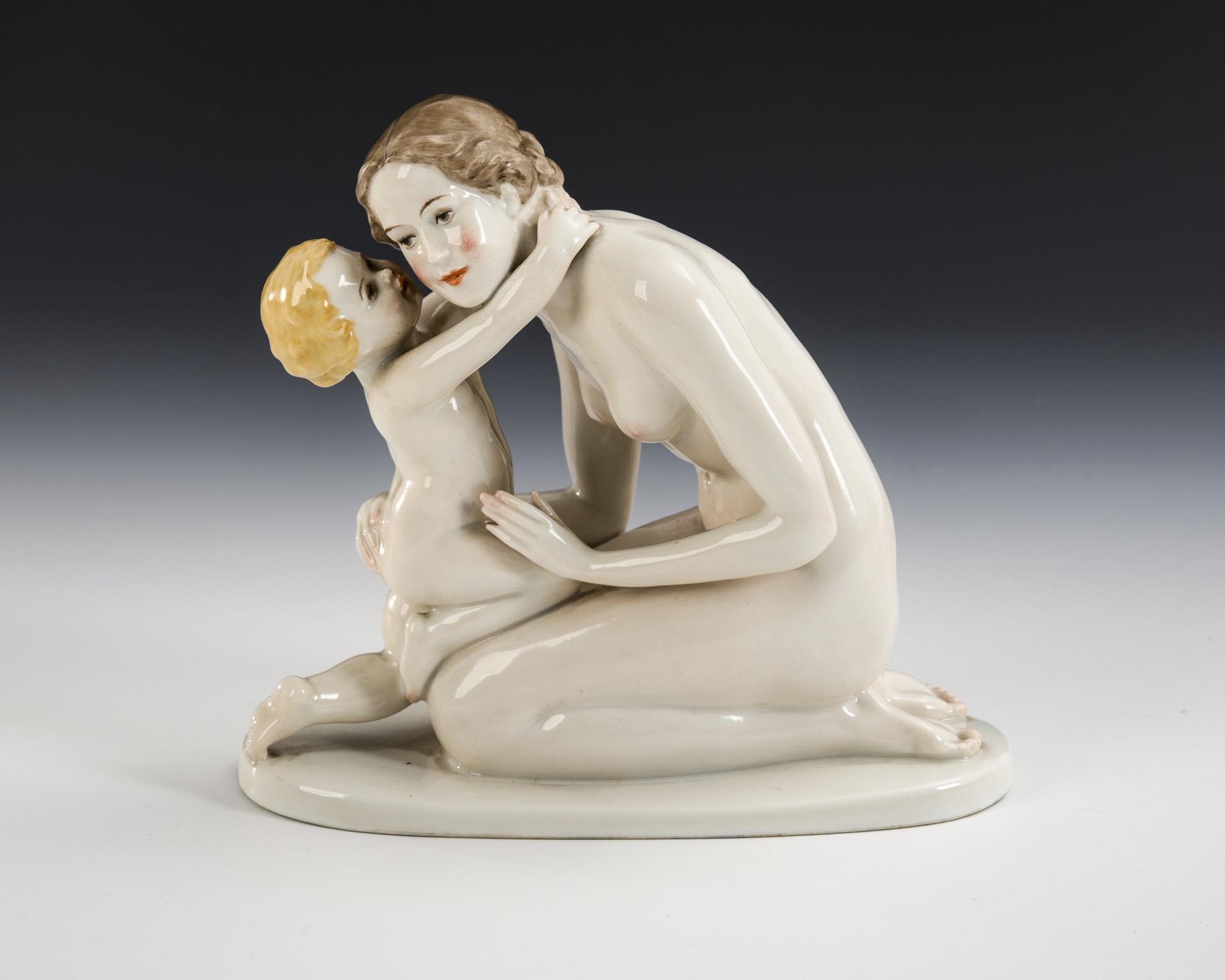 Auf einer Ovalplinthe kniende nackte junge Frau mit ihrem sie umarmenden, ihr ins Ohr flüsternden Kind
