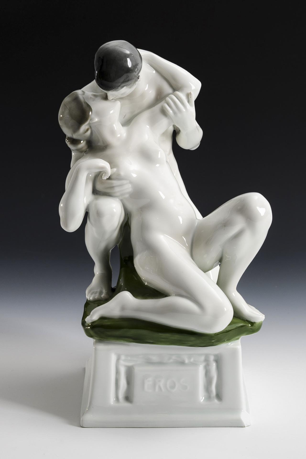 Auf einem Quadratpostament kniendes, nacktes, sich küssendes Liebespaar