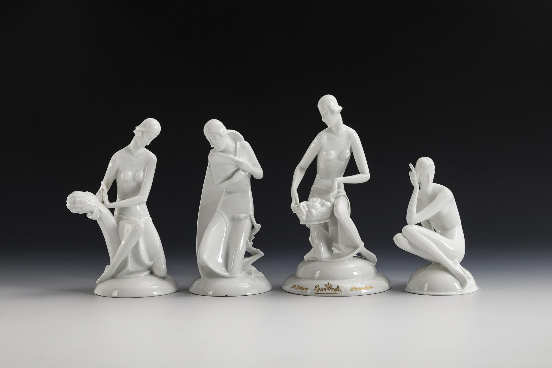 3 Frauenfiguren als Sommer, Herbst und Winter (Modell-Nr. K 982, S 983 und 984) sowie ein sitzender Frauenakt (Modell-Nr. 574). 1x am Sockel bezeichnet "50 Jahre Rosenthal Porzellan"