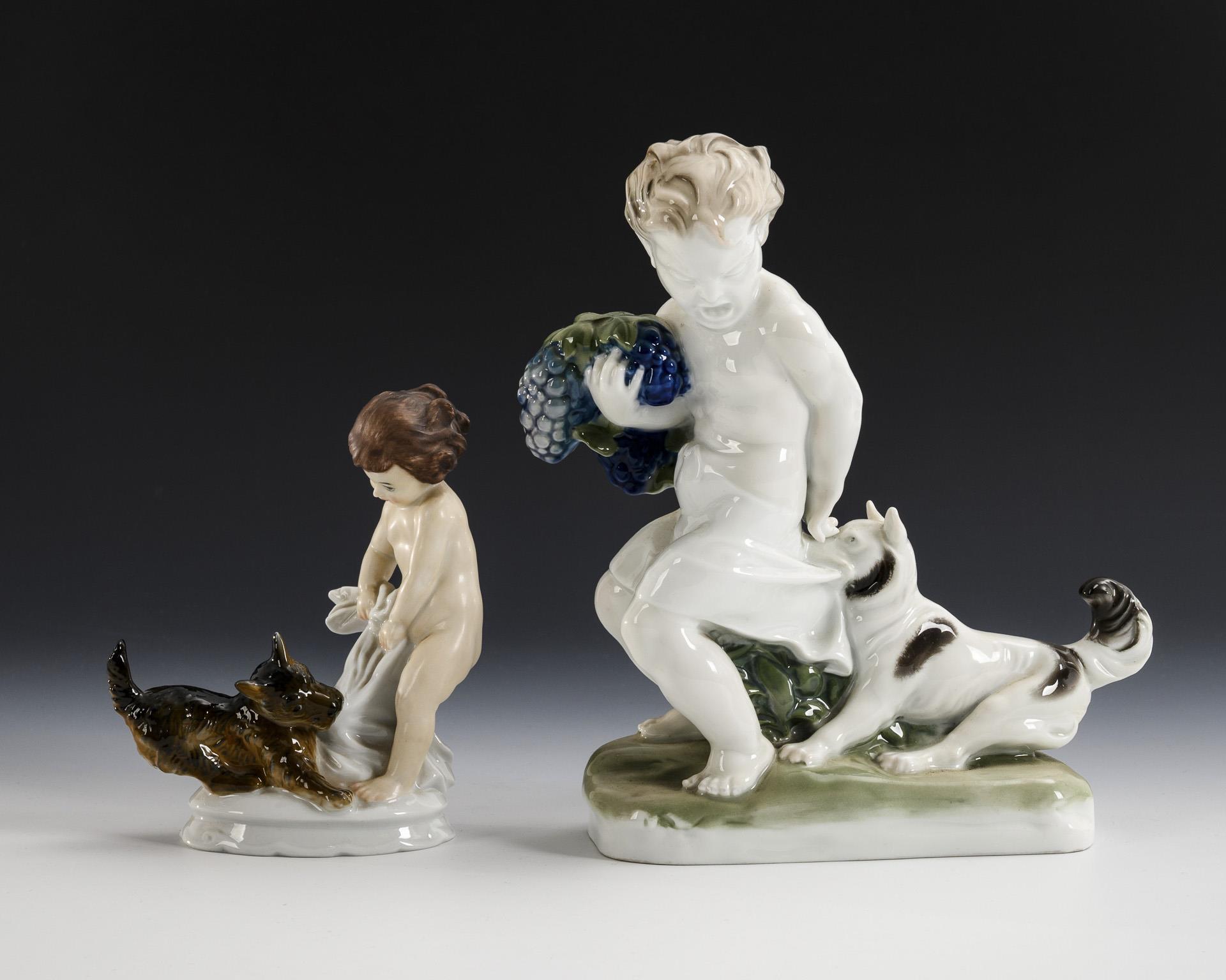 1x "Erwischt", Modell-Nr. 538, Entwurf 1919 von Ferdinand Liebermann (1883-1941): Putto mit Trauben sowie ein diesen am Lendentuch packender Hund. / 1x "Neckerei", Modell-Nr. 496, Entwurf um 1929 von Max Hermann Fritz (1873-1948): mit einem Terrier spielender Putto