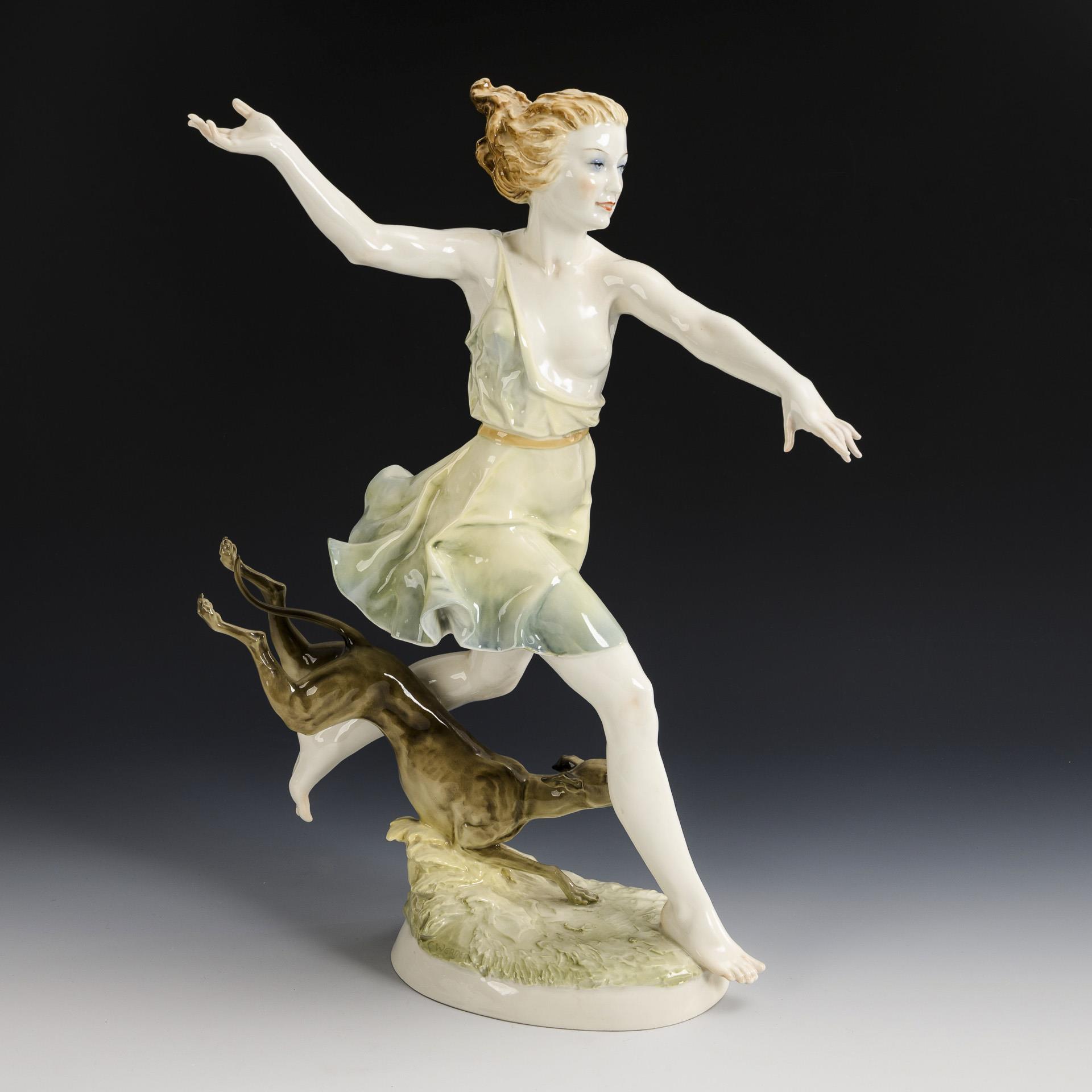 Große Plastik einer gemeinsam mit einem Windhund laufenden jungen Frau mit entblößter Brust
